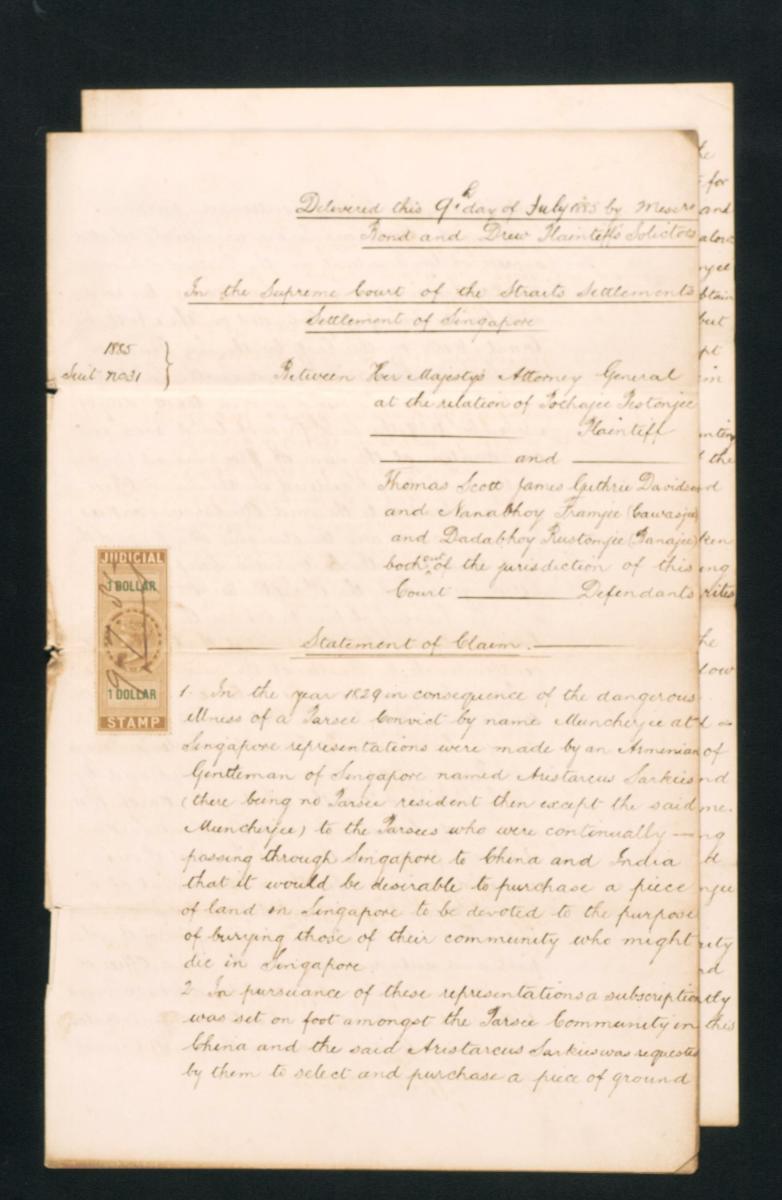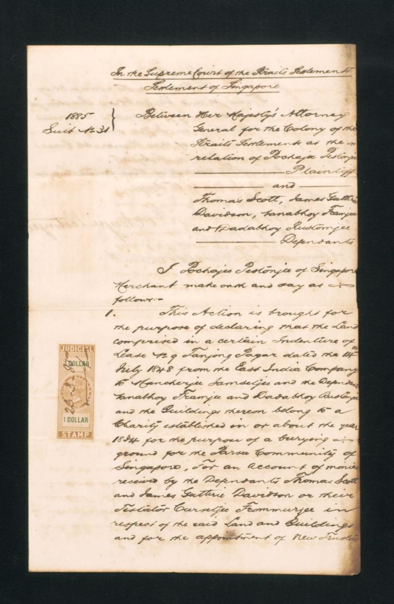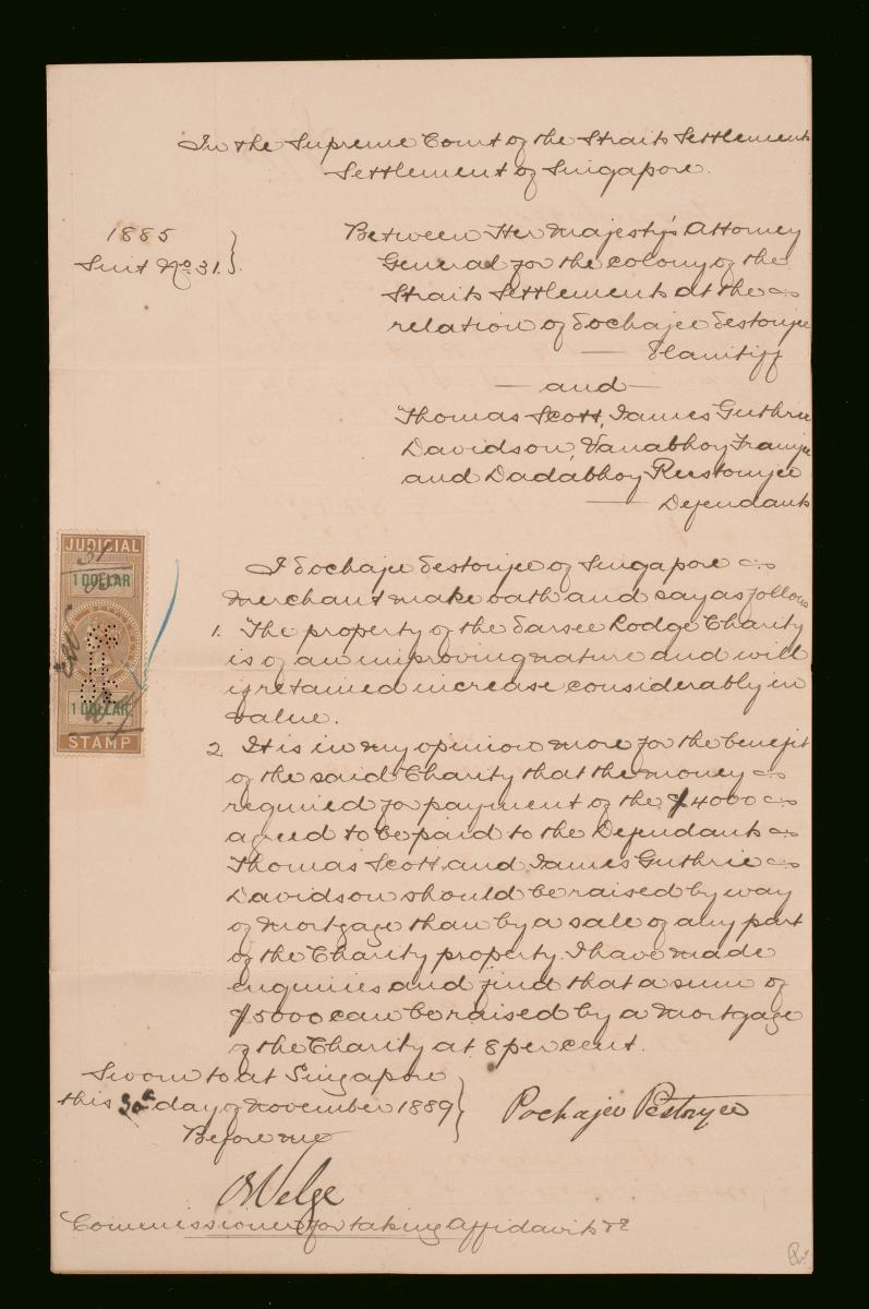 This is the affidavit of Pachajee Pestorajee filed on 8 March 1888 verifying the statement of claim. He was the plaintiff in the case between the Attorney General, who was acting on behalf of Pestorajee, and Thomas Scott, James Guthrie Davidson, and Namahoy Framjee (defendants). There were two other defendants named Cawasjee and Dadabhoy Prestorjee who were out of the jurisdiction of the Supreme Court of the Straits Settlements. This affidavit is part of a collection of legal documents from the 19th and early 20th centuries which provides a glimpse into the work of the notable personalities who left their mark on Singapore’s legal history, and the economic and other transactions undertaken by ordinary immigrants in 19th century Singapore that tell stories of misfortune and indebtedness which would otherwise have disappeared from history.