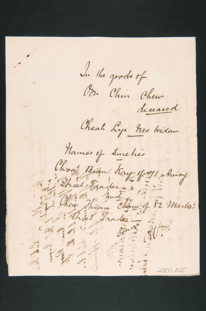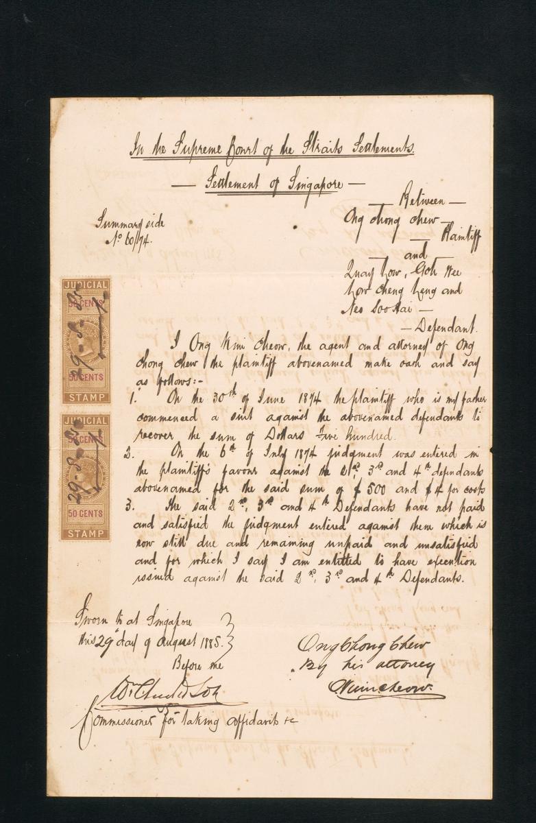 This is a motion paper issued on behalf of Tan Kim Boey on 29 March 1883 in relation to the goods of Woon Chin Chew. It is part of a collection of legal documents from the 19th and early 20th centuries which provides a glimpse into the work of the notable personalities who left their mark on Singapore’s legal history, and the economic and other transactions undertaken by ordinary immigrants in 19th century Singapore that tell stories of misfortune and indebtedness which would otherwise have disappeared from history.
