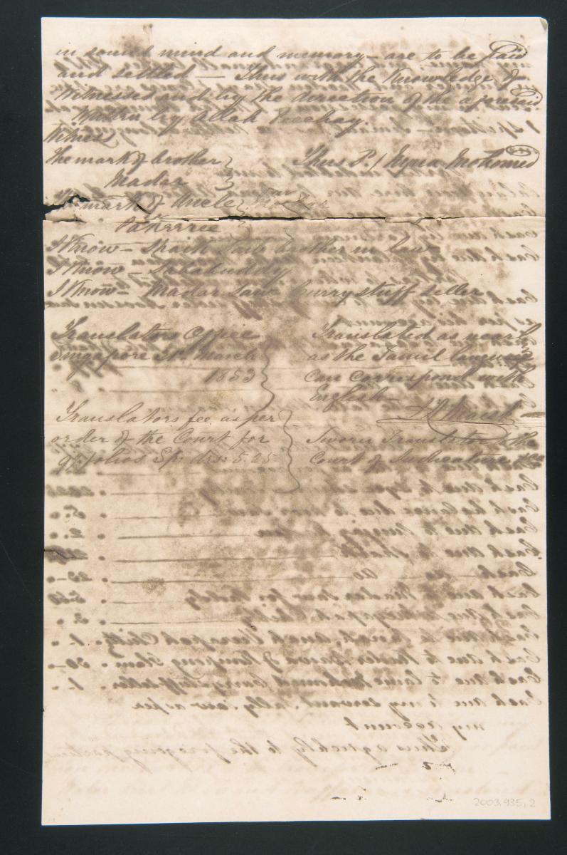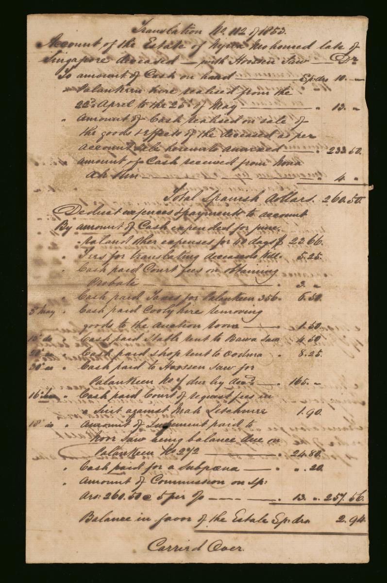 These are accounts of the goods of Nyna Mahomed compiled in 1853. They are part of a collection of legal documents from the 19th and early 20th centuries which provides a glimpse into the work of the notable personalities who left their mark on Singapore’s legal history, and the economic and other transactions undertaken by ordinary immigrants in 19th century Singapore that tell stories of misfortune and indebtedness which would otherwise have disappeared from history.