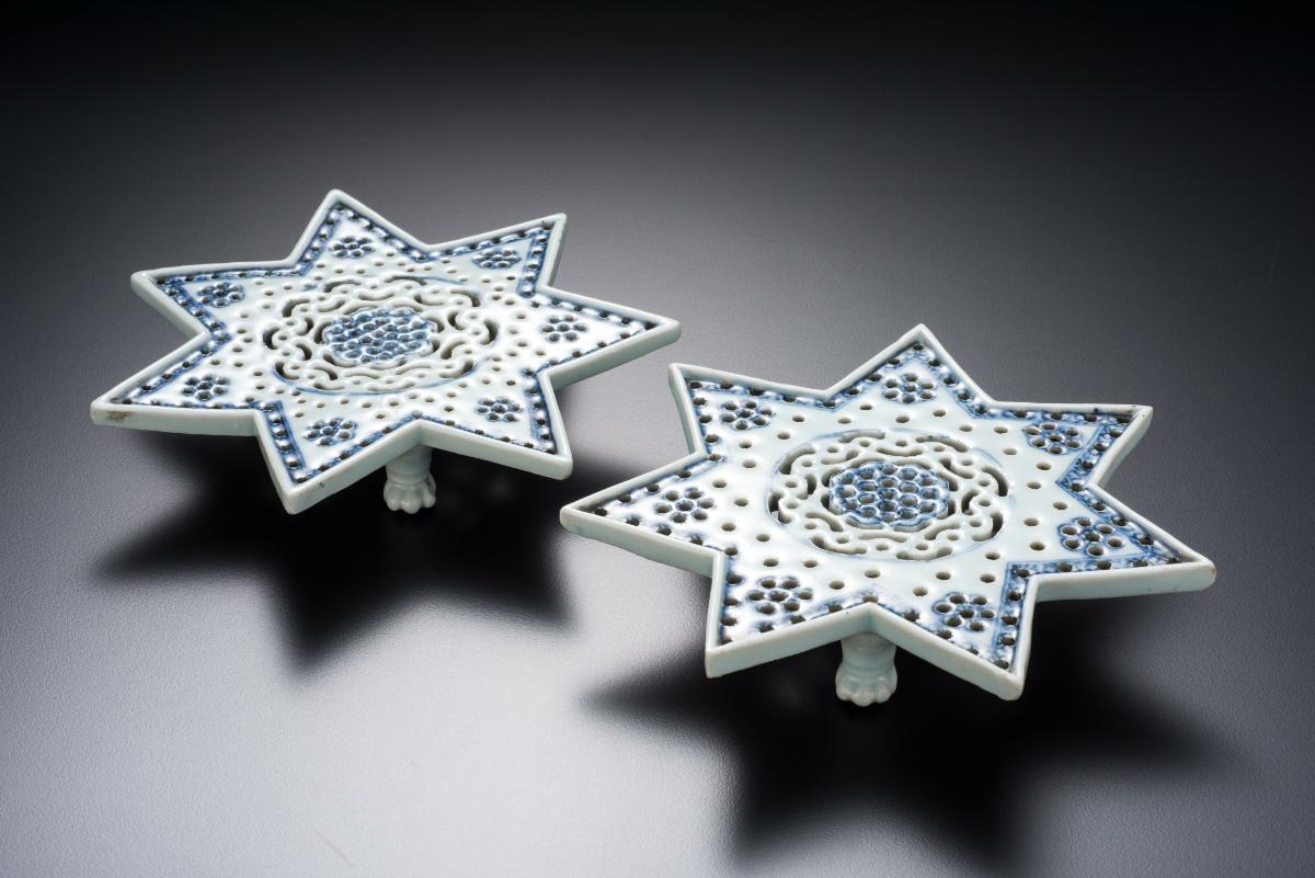 This pair of drum-shaped containers feature tiny beads of clay, which were applied to the lid and container before they were fired. The containers are decorated mythical beasts perched on a rock amid waves. These containers may have been used for holding 'weiqi' or chess seeds. Playing Chinese chess or weiqi is regarded as one of the 'Four Pursuits' of a scholar, the other three being music, calligraphy and painting.