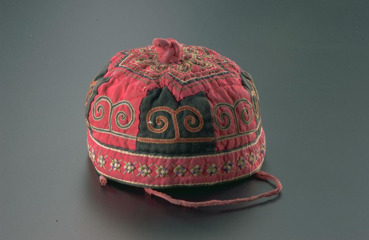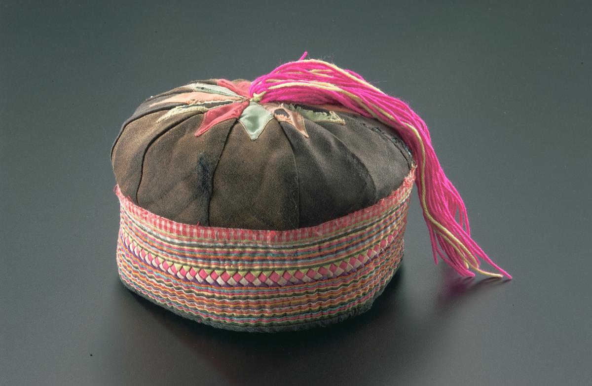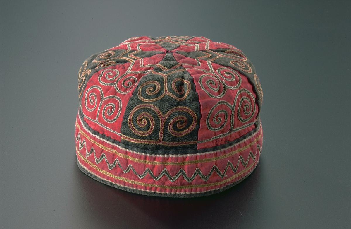 This 'topi' (prayer cap) is worn by Parsi children. It is made stiff by use of buckram and or cardboard. Velvet is embroidered largely in 'zari' (silver thread). This type of cap was popular in early 20th century. The black velvet cap in the centre is embellished with flora and birds motifs.