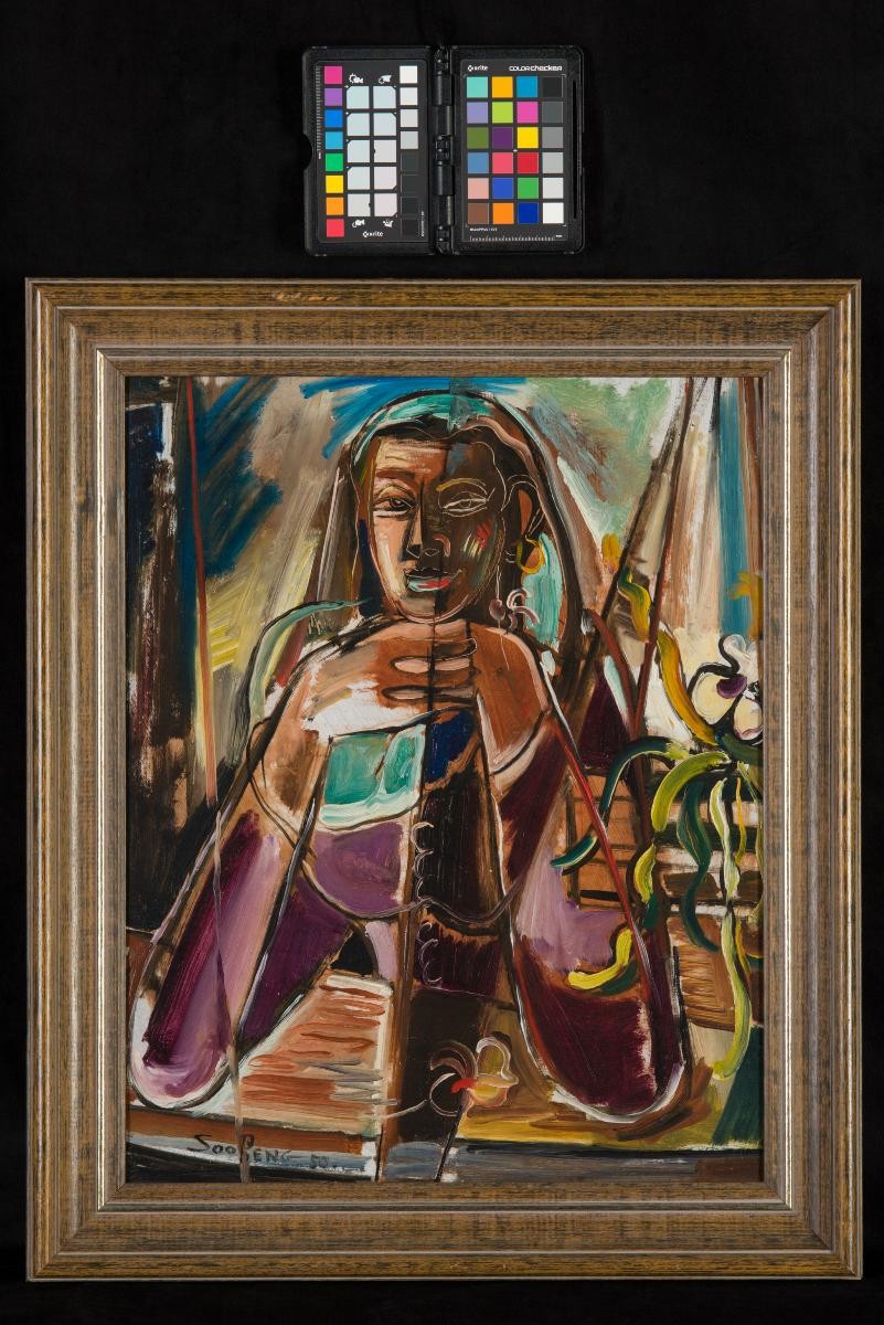 Born in Guangdong Province, China, Chen Chong Swee (1910-1985) came to Singapore in 1931 shortly after graduating from Xinhua Academy of Art, Shanghai. He co-founded the Salon Art Society (now the Singapore Society of Chinese Artists) in 1935 and was a teacher with Nanyang Academy of Fine Arts for over 20 years. In 1952, Chen, together with fellow artists Chen Wen Hsi, Cheong Soo Pieng and Liu Kang, went on what would eventually turn out be a historically significant trip to Bali, Indonesia in search of new inspiration and subject matter. As one of the first artists instrumental in developing the Nanyang Style, Chen pioneered attempts to interpret local landscapes according to the Chinese concept of pictorial composition with Western watercolour techniques.Throughout Chen’s artistic career, his style remained realistic as he believed that the objective of a painting must be understood by its viewer; his works are thus often inspired by his surroundings. In ‘Malay Woman’, Chen displays a sure hand in handling the difficult watercolour medium with layered build-up of colours. Much emphasis is placed on the contrast of light and shadow to achieve a three-dimensional effect, bringing out the facial features of the subject.