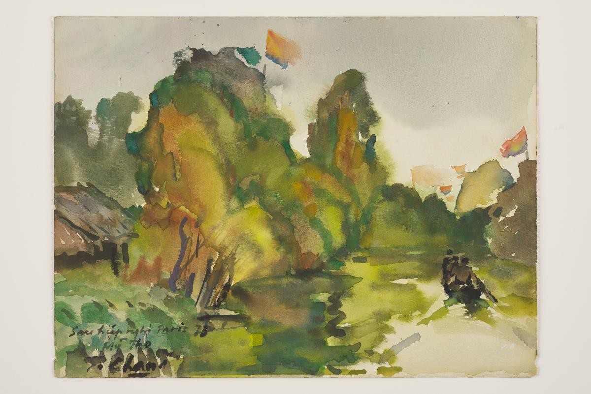 Born in 1928 in Malaysia, painter and sculptor Wee Kong Chai settled in Singapore in 1952. A graduate of the Singapore Academy of Arts (1957-60), Wee left for Paris in 1964 to study at the École Nationale Supérieure Des Beaux-Arts, returning to Singapore only five years later. Having arrived in Paris the previous year, Wee demonstrates with ‘A Scene in Paris’ from 1965 the changes his painting style has already undergone since his recent arrival. This work reflects the artist’s new preoccupation with recording light and form, heavily modulated and verging towards abstraction, all executed with a looser grip on the brush unlike his laboured earlier works. It is easy to imagine Wee seated at his portable easel, painting in the “en plein air” tradition to perhaps escape the confines of a cramped classroom or his tiring dishwasher job, yet revelling in his newfound Parisian artist life.