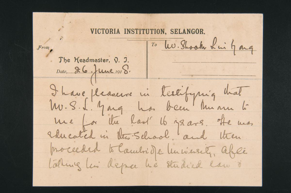 This is a testimonial for Yong Shook Lin dated 26 June 1918. It is part of a collection of legal documents from the 19th and early 20th centuries which provides a glimpse into the work of the notable personalities who left their mark on Singapore’s legal history, and the economic and other transactions undertaken by ordinary immigrants in 19th century Singapore that tell stories of misfortune and indebtedness which would otherwise have disappeared from history.