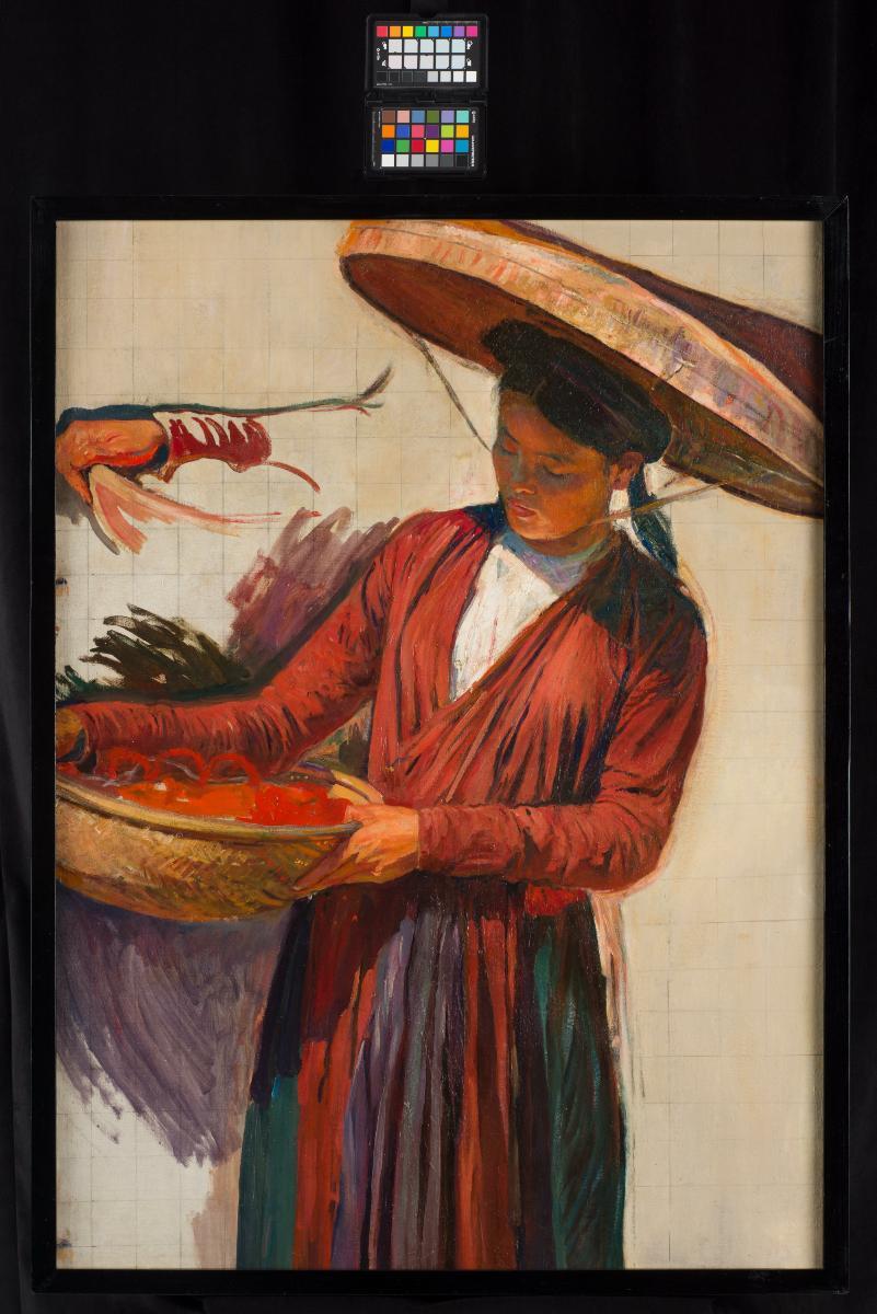 Born in Guangdong Province, China, Chen Chong Swee (1910-1985) came to Singapore in 1931 shortly after graduating from Xinhua Academy of Art, Shanghai. He co-founded the Salon Art Society (now the Singapore Society of Chinese Artists) in 1935 and was a teacher with Nanyang Academy of Fine Arts for over 20 years. In 1952, Chen, together with fellow artists Chen Wen Hsi, Cheong Soo Pieng and Liu Kang, went on what would eventually turn out be a historically significant trip to Bali, Indonesia in search of new inspiration and subject matter. As one of the first artists instrumental in developing the Nanyang Style, Chen pioneered attempts to interpret local landscapes according to the Chinese concept of pictorial composition with Western watercolour techniques.Although Chen advocated the fusion of Eastern and Western approaches to art, he was a firm believer in the mastering of draughtsmanship and foundation skills before attempting to experiment. Throughout his career, his artistic style remained realistic as he believed that the objective of a painting must be understood by its viewer. Inspired by his surroundings, his subject matters are hence uniquely Southeast Asian, such as the woman in this work.