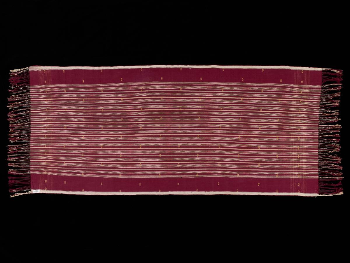 This is a rare example of a pattern board for the weaving of sacred warp 'ikat pua' (woven cloth) textiles. It was used as a template during the process of tying resists prior to dyeing. By repeating and reversing the orders of the strings, the design of the body of the cloth was created.Warp ikat involves the tying and dyeing of the warp (vertical) threads with the design for the textile prior to weaving.