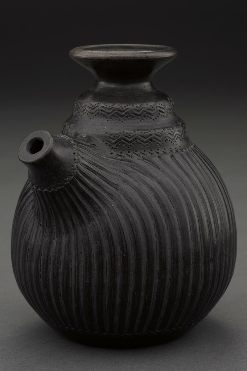 Kendi is a water drinking vessel that is held by the neck when it is filled or poured. This kendi, in the form of a frog, is decorated with floral motifs on a spotted blue ground. The tubular neck comprises partly of a silver mount, and a cap, which is linked by two chains to a flower-shaped stopper at the spout.This piece highlights the trade in Chinese ceramics. Kendi, modelled in the form of frogs, were exported to Europe, the Middle East and other parts of Asia. The silver mount is of Turkish origin and illustrates the value accorded to Chinese porcelain by their foreign owners.