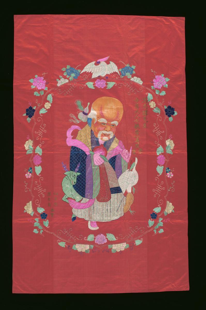 This panel is elaborately embroidered with gold and coloured silk threads. It is decorated with the three stellar gods, the eight Daoist immortals and lions, a protective symbol. This large and impressive embroidered panel would have been used for a decoration at a birthday celebration, particularly of a senior member of the family. The ‘shou’ character means longevity and is a reference to Shou Lau, the Daoist god of longevity.