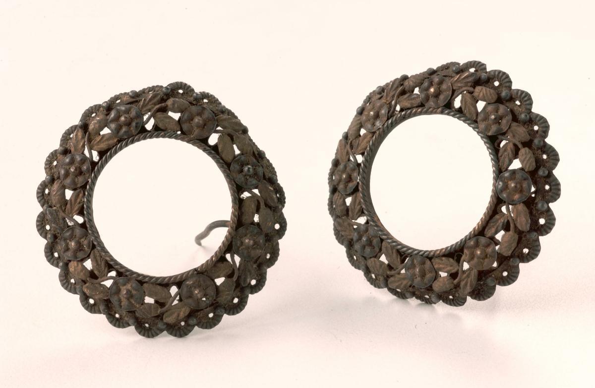 This pair of cruets is decorated in high relief with scrolling of overlapping vines and flowers. They are cast silver and mercury gilded, a type of gilding banned in Europe in the 18th century because of health dangers but continued in the Philippines until the early 20th century.They were commissioned by a wealthy church or monastery belonging to the Order of St. Francis. They bear the emblem of the Franciscan Order which consists of the crossed arms of Christ and St. Francis with the image of the cross behind it. The surmounting A and V stand for the Latin 'aqua' (water) and 'vinum' (wine) respectively and they were used in Catholic Holy Mass to hold water and wine. The mixing of water and wine were symbolic of the blood and sweat, that is the sufferings of Christ to save the world.