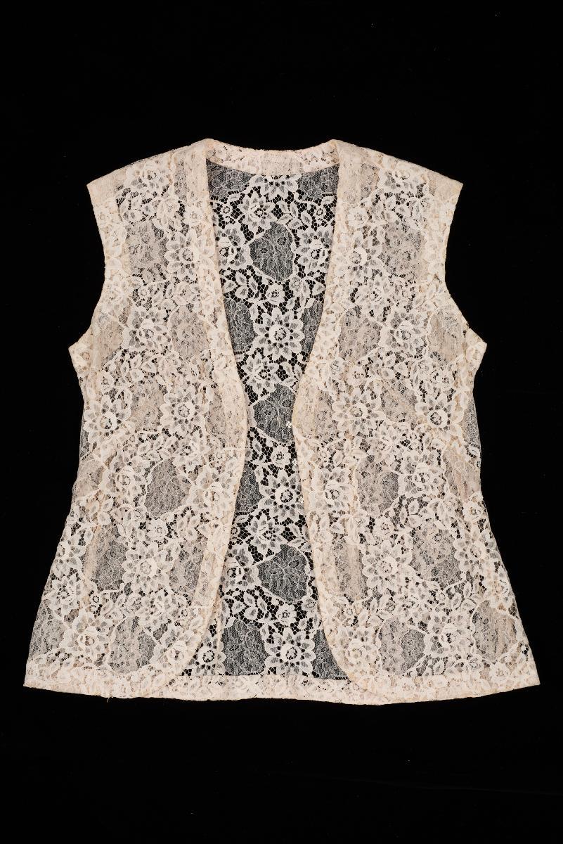 This yellow floral jacket is worn with a sleeveless cheongsam. It has a U-shaped neckline and is secured by a row of fabric wrapped buttons at the centre. The jacket belonged to the late Datin Aw Cheng Hu, daughter of Mr. Aw Boon Par. Mr. Aw was a philanthropist best known for introducing the heat rub, Tiger Balm. The cheongsam and jacket were made by Shanghainese tailors with fabric bought from High Street. Datin Aw also had a matching set of jewellery for each cheongsam.