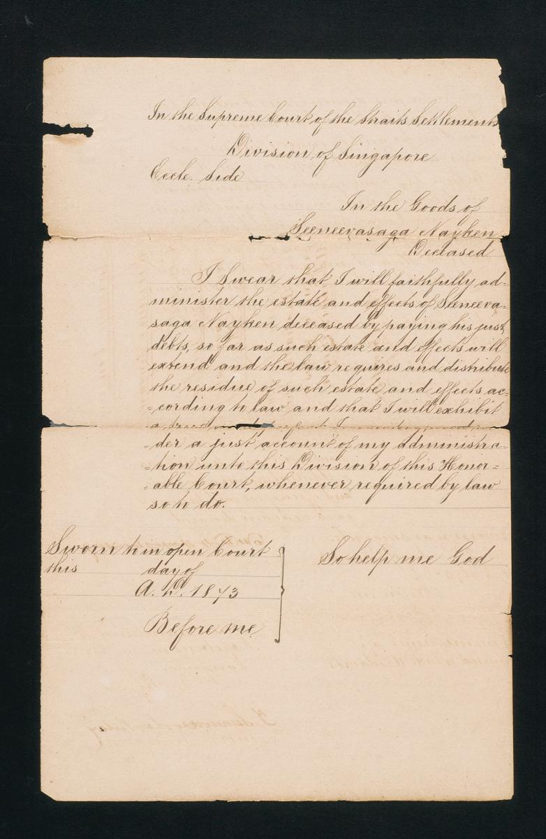 This is an oath sworn in April 1884 by Ahna Lana Nana Raman Chitty concerning the administration of the estate of the deceased Ahma Lana Nana Palaniappa Chitty. It is part of a collection of legal documents from the 19th and early 20th centuries which provides a glimpse into the work of the notable personalities who left their mark on Singapore’s legal history, and the economic and other transactions undertaken by ordinary immigrants in 19th century Singapore that tell stories of misfortune and indebtedness which would otherwise have disappeared from history.