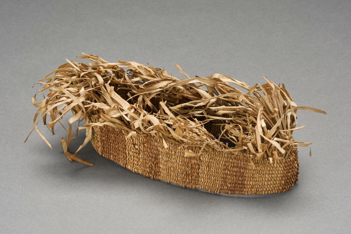 This headband is made of closely-plaited thin strips of black and cream coloured rattan patterns. It has a tuft of rattan fringe all the way round. These are worn by the Kayan and Kenyah girls of Sarawak.Plaiting with strands of contrasting colours to form designs is a distinct and well developed decorative technique in Borneo.