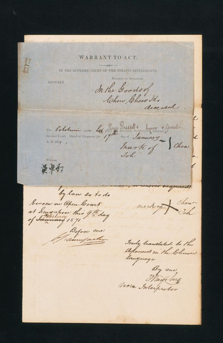 These are the warrant to act and the petition issued by Nynamsah Lebby concerning the administration of the estate of Hassan Hussain Bawa. They are part of a collection of legal documents from the 19th and early 20th centuries which provides a glimpse into the work of the notable personalities who left their mark on Singapore’s legal history, and the economic and other transactions undertaken by ordinary immigrants in 19th century Singapore that tell stories of misfortune and indebtedness which would otherwise have disappeared from history.