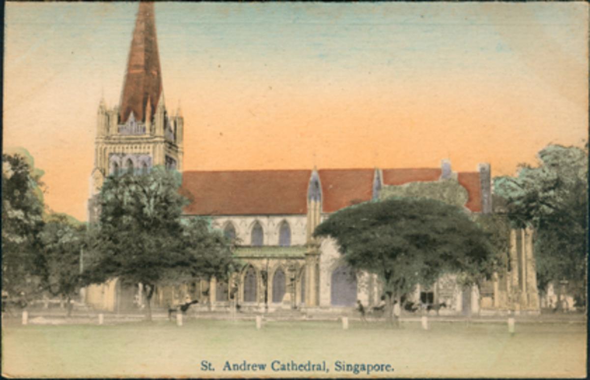 This print (wood engraving) was made from a photograph taken from Fort Canning before 1865. Featured in the foreground is the European burial ground, while the Cathedral of the Good Shepherd sits prominently in the centre of the engraving. The harbour can also be seen in the background of the engraving.