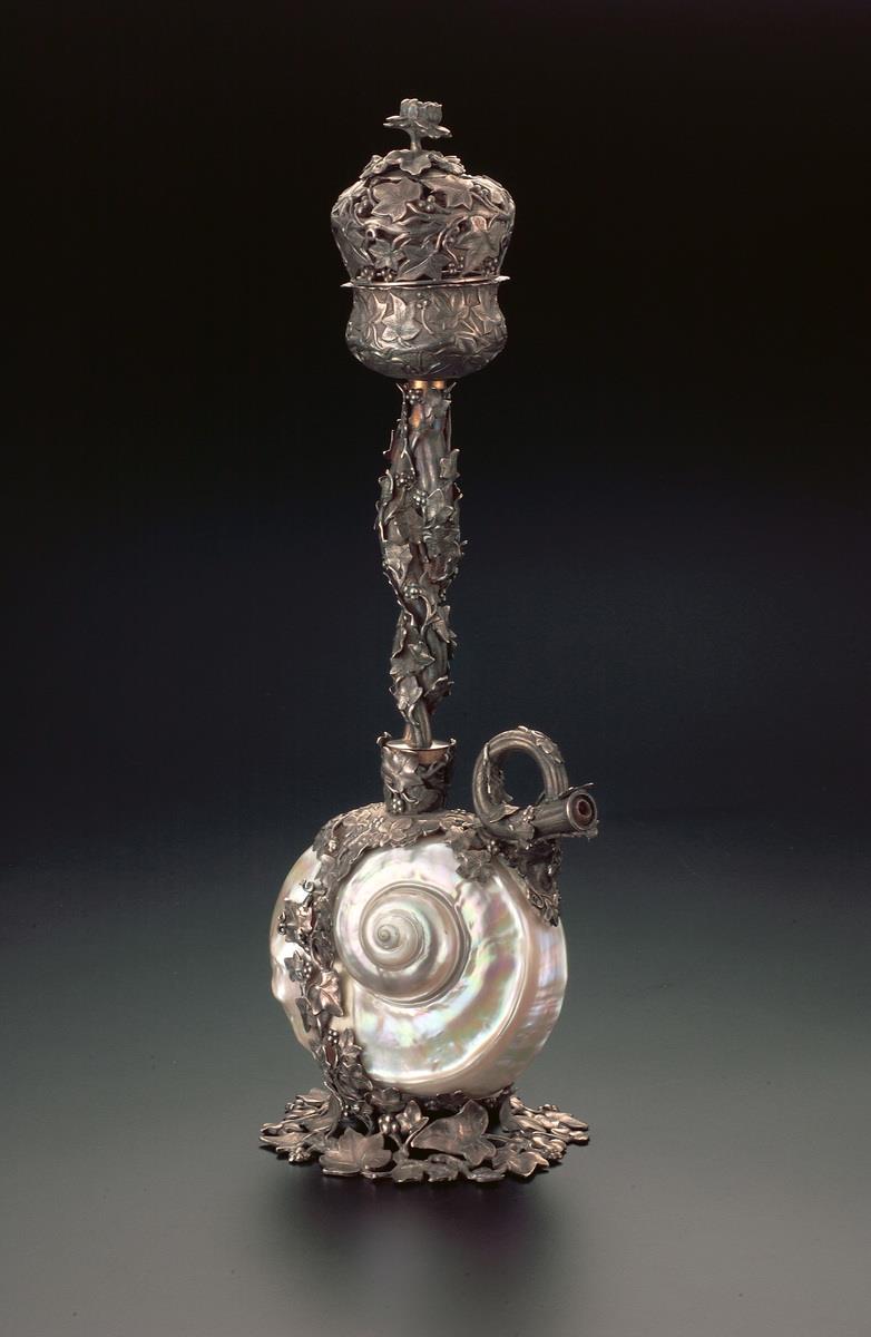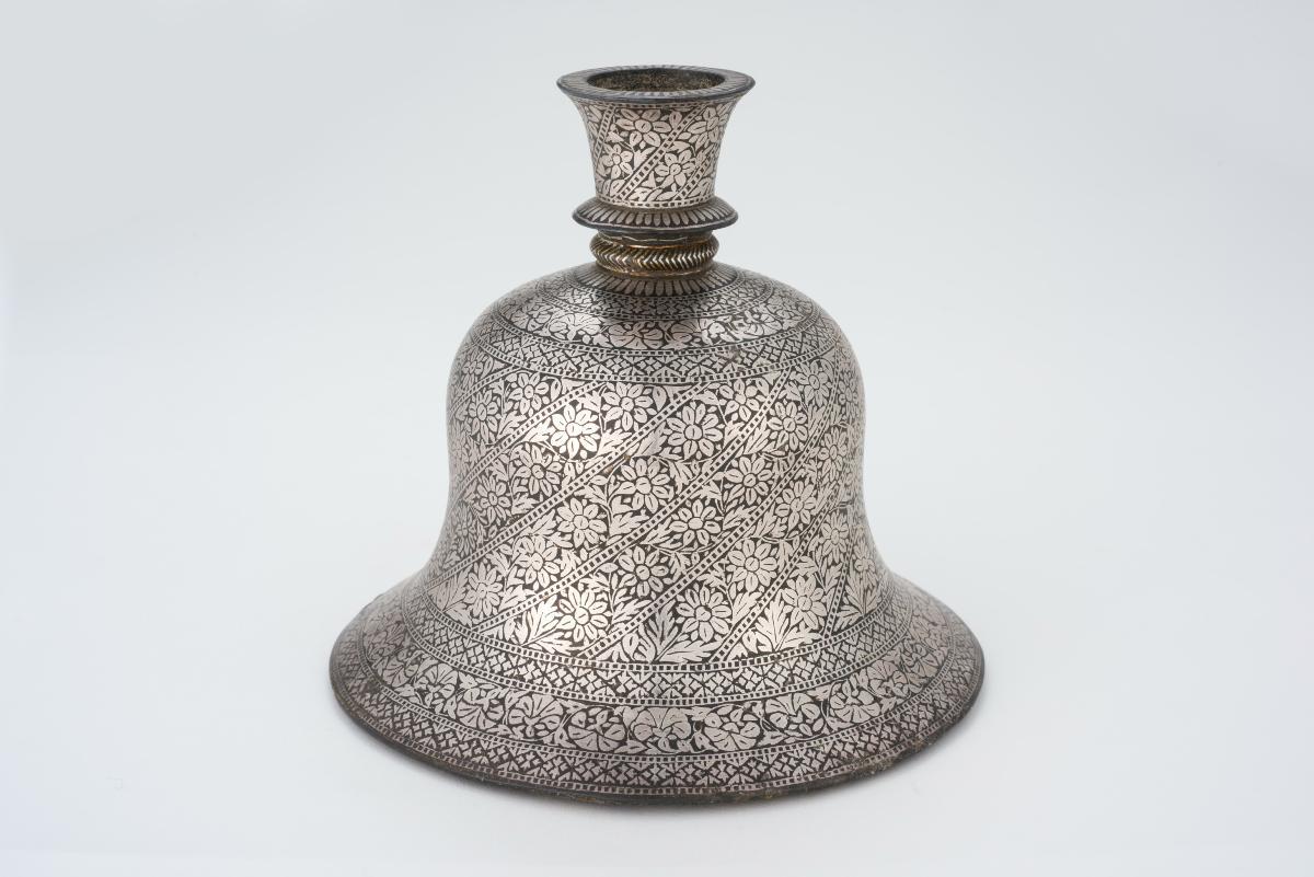 This stylised blue and white elephant 'kendi' with an elegant gilt-silver repoussé mount has been transformed into a water pipe. The gilt trunk attached to the porcelain body has an open finial for the pipe. While the elongated square tower with a hinged lid and floral finial serves as the burner. The huqqa base, made in China during the Ming period (1368-1644), is an excellent example of West Asia's love for Chinese import wares and how luxury goods were often adapted to suit local tastes.