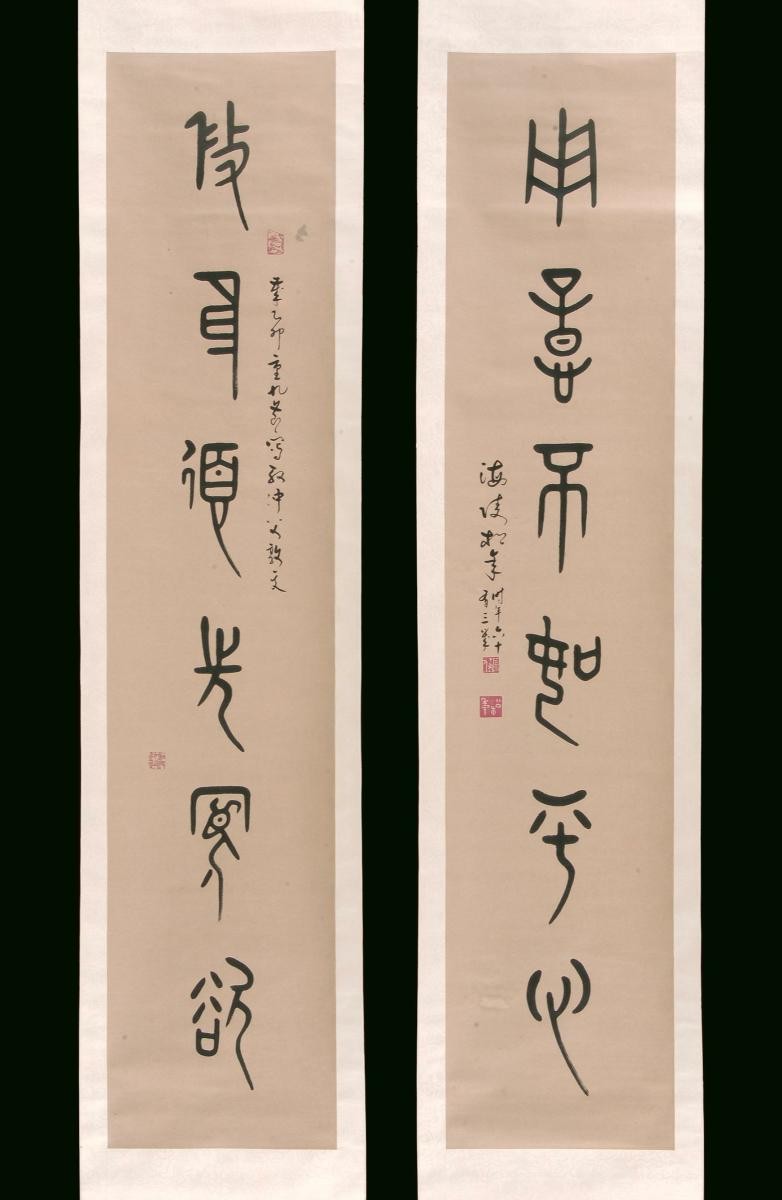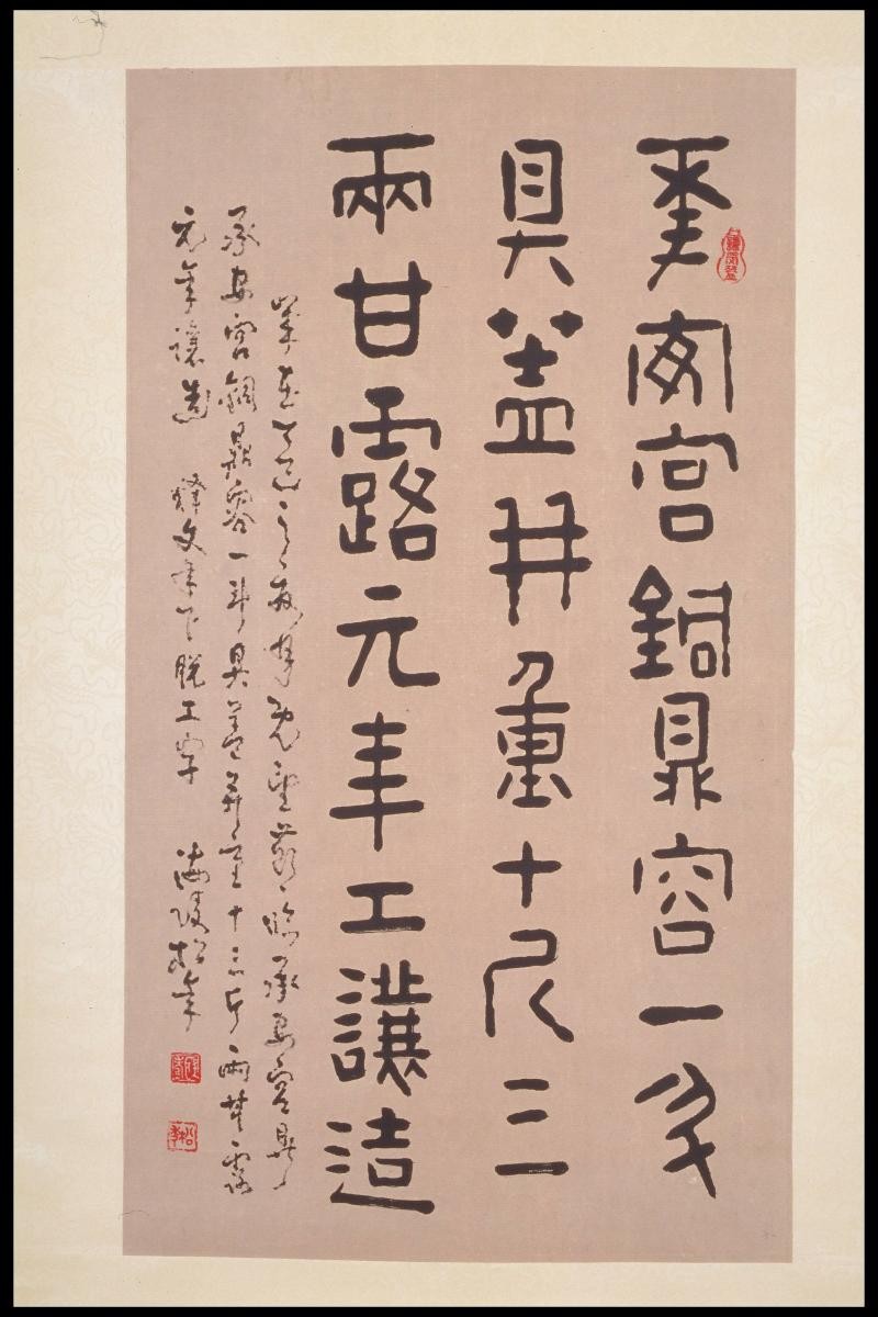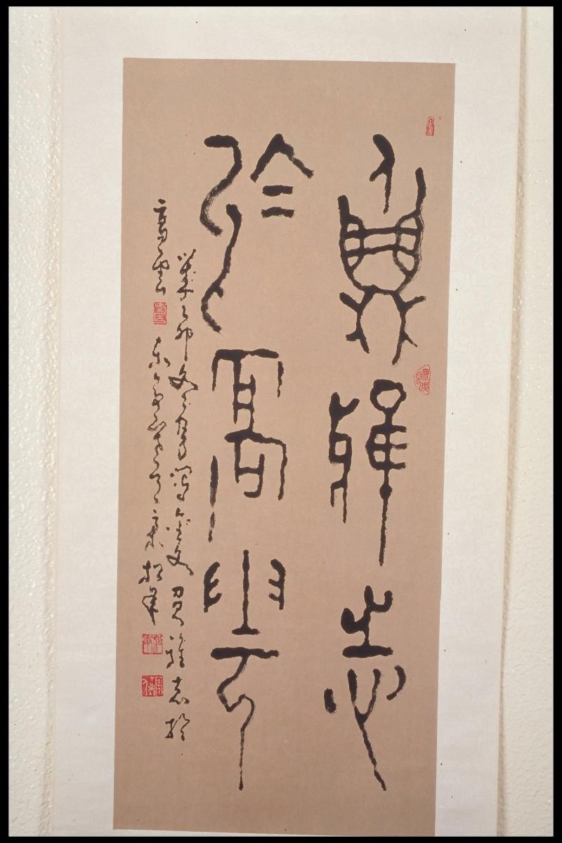 Born in Jiangsu, China, to a family of distinguished scholars, Reverend Song Nian (1911-1997), commoner name Song Tiecheng, studied in a private school and practised calligraphy from the tender age of six. At 16, he entered the monastery and shortly after, enrolled in Tsinghua University in 1928 to study literature. A student of famous Jiangnan scholar Xiao Tiu’an and other teachers, Song Nian consolidated what he had learnt and eventually developed an original script, known as the ‘Song Nian Style’. He emigrated to Singapore in 1961 and was the head of Puti Temple. Well-versed in the traditional Chinese art forms, namely poetry, painting, calligraphy and seal-carving, Song Nian was a renowned figure in Singapore’s art scene. This calligraphy by Song Nian which describes a battlefield, is written in the ancient bronze inscription script that can be found cast or engraved on bronze objects of the Shang and Zhou dynasties (c. 1600-300BCE).