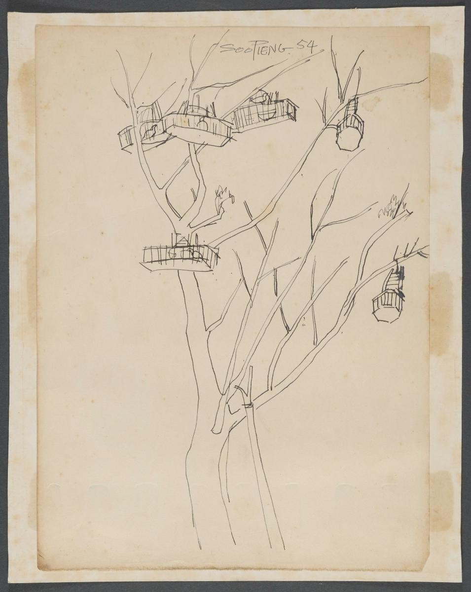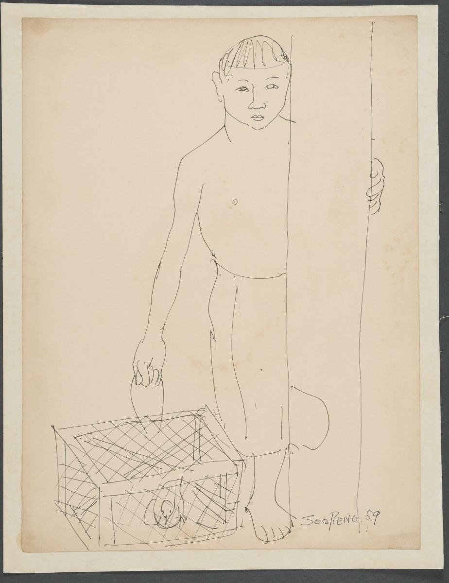 Cheong Soo Pieng was born in Amoy, China in 1917. He studied at the Amoy Art Academy and the Xinhua Academy of Fine Arts in Shanghai from 1933 to 1936. In 1946, Cheong settled in Singapore and taught at the Nanyang Academy of Fine Arts until 1961. Together with fellow artists Chen Wen Hsi, Chen Chong Swee and Liu Kang, they went to Bali, Indonesia in 1952 in search of new inspiration and subject matter. Cheong had a dominant influence on the development of modern art in Singapore and is regarded as one of Singapore’s pioneer artists. His innovative experimentations towards developing his stylistic oeuvre had a great influence on his students, many of whom later became established artists in the region. For his contributions in art, he was awarded the Meritorious Service Medal by the Singapore government in 1962. Cheong passed away in 1983 in Singapore.Cheong was one of the most experimental amongst the pioneer artists; he often astounded the art scene with his avant-garde works. This painting shows influence from Cubism. Although undated, the grid overlay, brown palette and stylization of the human figure date the work from the mid 1950s; ‘Goats, Figures and Jugs’ from 1959, in the SAM collection, shows similar qualities.