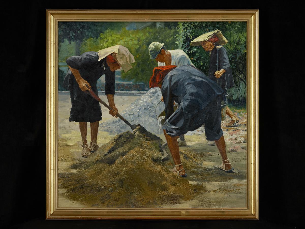 Born in 1923, Lim Tze Peng is largely a self-taught artist. In his oeuvre, ink paintings and calligraphic works feature prominently, although there is a small number of oils, watercolours and drawings. He created a unique style of ink painting using rich brush and tonal details, and this approach is often regarded as a manifestation of the Nanyang Style in the ink medium. Lim, a school principal until his retirement in the early 1980s, was awarded the Cultural Medallion by the Singapore government in 2003.Besides painting streets scenes, Lim also painted trades and lifestyles that were fast vanishing due to changing times. This painting shows ‘samsui’ women, in their characteristic red hats, panning for raw materials. These women hail from the San Shui (three rivers) county of Guangdong and have arrived in Malaya since the early 19th century to seek a new life, often working as labourers in the construction and mining industries.