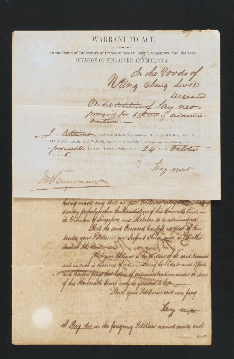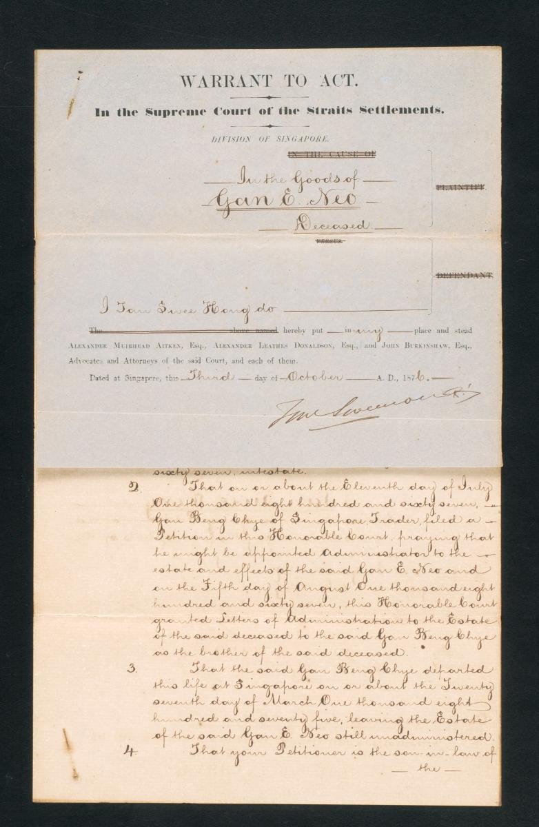 This is a warrant to act issued by Teo Huet Swee on 11 March 1861 concerning the administration of the estate of the deceased Teo Ong Chuan. It is part of a collection of legal documents from the 19th and early 20th centuries which provides a glimpse into the work of the notable personalities who left their mark on Singapore’s legal history, and the economic and other transactions undertaken by ordinary immigrants in 19th century Singapore that tell stories of misfortune and indebtedness which would otherwise have disappeared from history.
