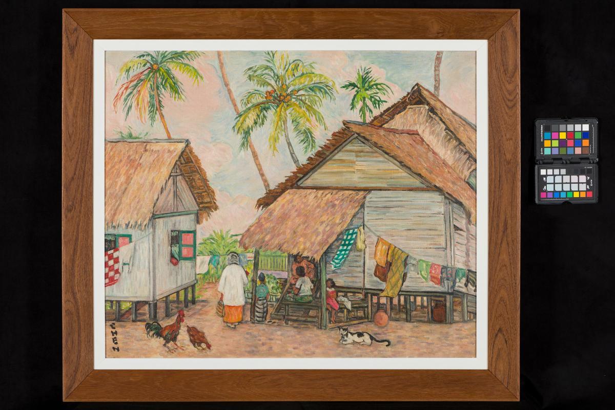 Born in Fujian Province, Liu Kang (1911-2004) received his formal training in Shanghai Academy of Fine Art, where he was exposed to Chinese paintings. In 1928, he went to Paris where he was influenced by art movements such as Fauvism and Post-Impressionism. Not only was he one of Singapore’s pioneer artists, he was also a leading figure in the Society of Chinese Artists and the Singapore Art Society. In 1970, he was awarded the Public Service Star for his contributions in the field of art.In the 1950s, Liu experimented with the technique of batik painting with his friend and fellow artist, Chuah Thean Teng. Although painted in oils, the influence of batik is apparent in the white outlines, large areas of single flat colour and the elimination of small details.