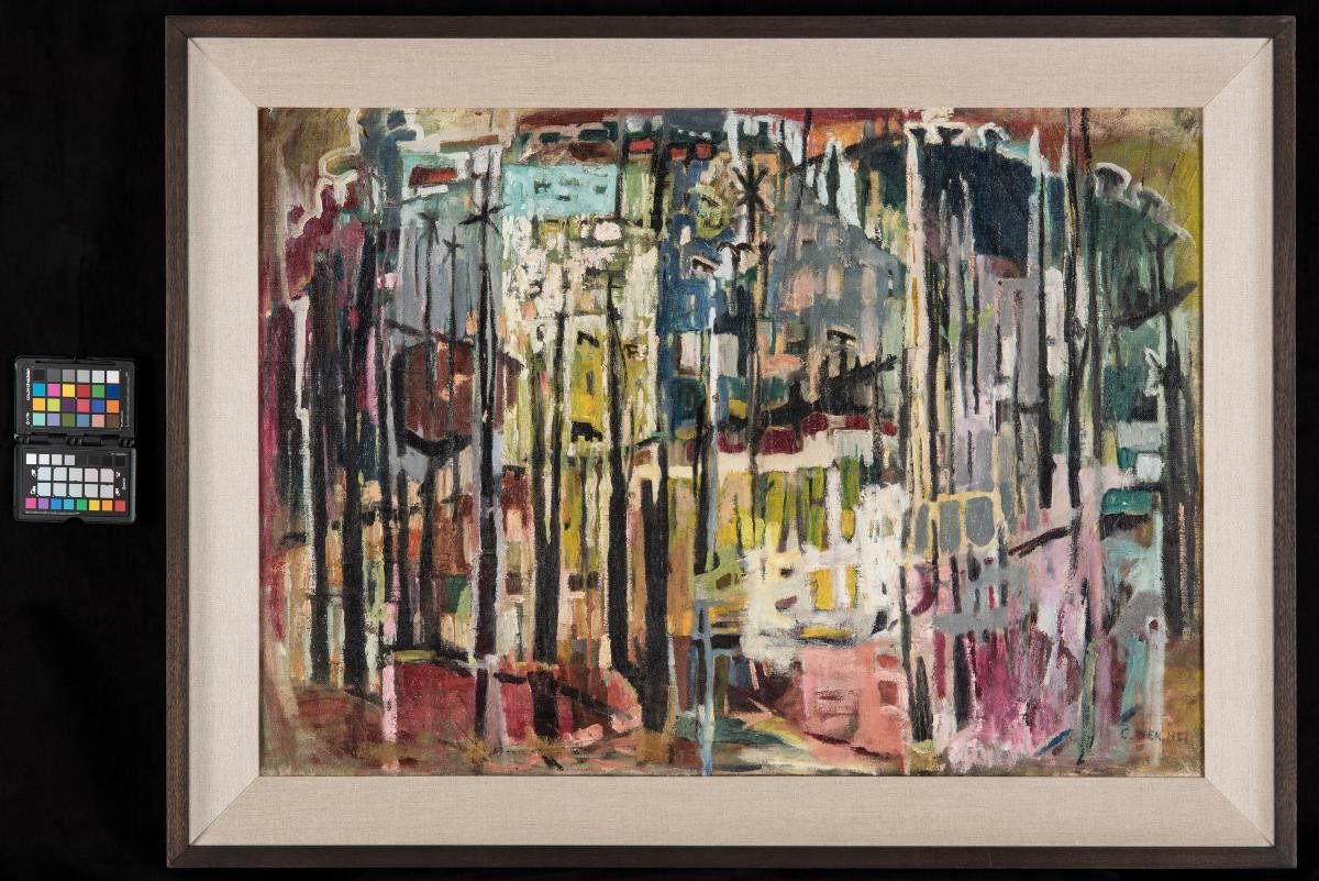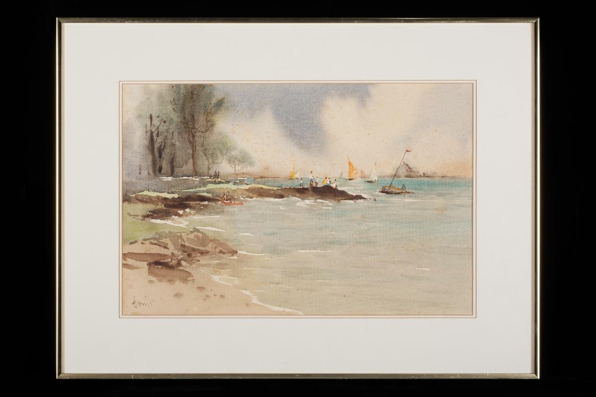 Born in Fujian Province, Liu Kang (1911-2004) received his formal training in Shanghai Academy of Fine Art, where he was exposed to Chinese paintings. In 1928, he went to Paris where he was influenced by art movements such as Fauvism and Post-Impressionism. Not only was he one of Singapore’s pioneer artists, he was also a leading figure in the Society of Chinese Artists and the Singapore Art Society. In 1970, he was awarded the Public Service Star for his contributions in the field of art.An accomplished oil and pastel artist, this is a rare watercolour by Liu. This work is also rare on another account—the unusually heavy linework. The multi-tiered roof structure in the distance suggests that the location is Bali.