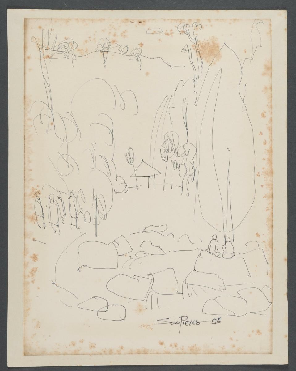 Born in 1923, Lim Tze Peng is mainly a self-taught artist. Ink paintings and calligraphic works are predominantly featured in his work, though there is a small collection of early oils, watercolours and drawings. He created a unique style of ink painting using rich brush and tonal details, and this approach is often regarded as a manifestation of the Nanyang Style in the ink medium. He was awarded the Cultural Medallion in 2003.A frequent traveller, Lim often went on painting trips to neighbouring countries to seek inspiration for his art which would tell the cultural and social narratives of a locale. Depicted here in his characteristic direct and representational style, through deft brushwork and ink washes, is a souvenir store selling masks.