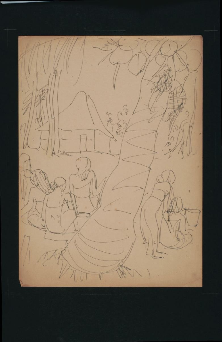 Born in 1923, Lim Tze Peng is largely a self-taught artist. In his oeuvre, ink paintings and calligraphic works feature prominently, although there is a small number of oils, watercolours and drawings. He created a unique style of ink painting using rich brush and tonal details, and this approach is often regarded as a manifestation of the Nanyang Style in the ink medium. Lim, a school principal until his retirement in the early 1980s, was awarded the Cultural Medallion by the Singapore government in 2003.Like many artists before and after him, Lim was inspired by the natural beauty of the Balinese landscape as well as the everyday community. Here the women are shown cooking in the midst of rich vegetation, reflecting the lushness of the tropical island.