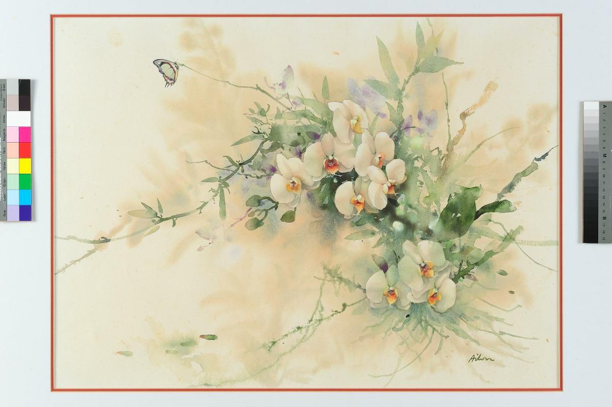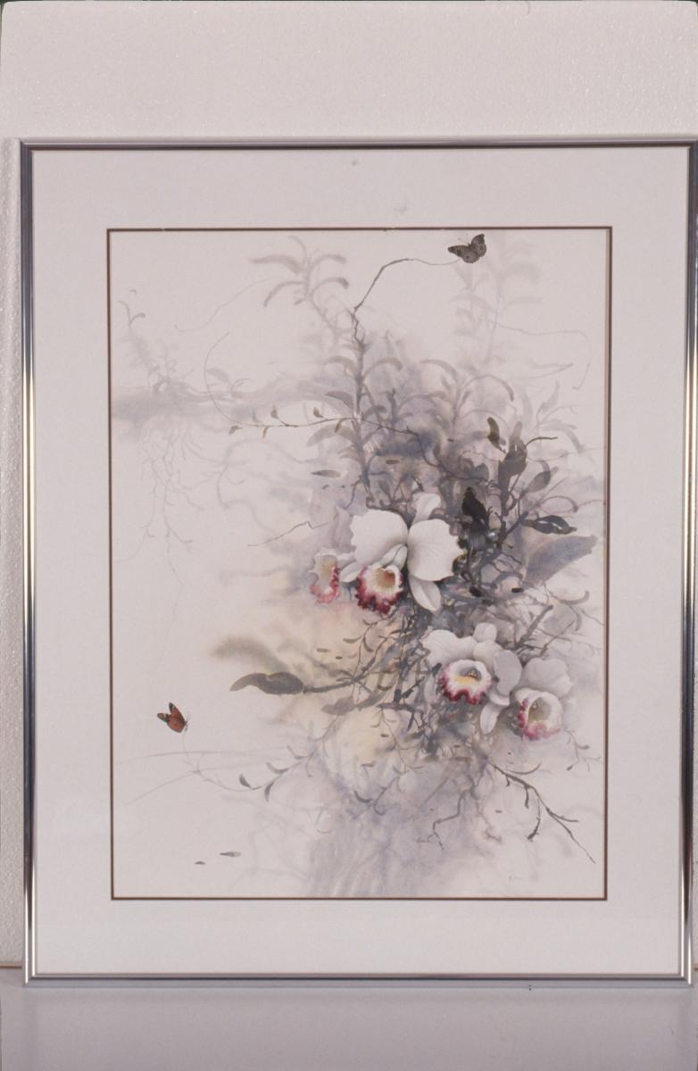 Born in China in 1906, Georgette Chen Li Ying received her art education in Paris, New York as well as in Shanghai. Chen’s artistic oeuvre can be divided into three phases, French Period (1927-1933); China-Hong Kong Period (1934-1948) and Penang-Singapore Period (1949-1980). Immensely inspired by her surroundings she produced still lifes, portraits and landscapes from each phase. Settling in Singapore in 1954, she taught at the Nanyang Academy of Fine Arts till her retirement in 1980. Regarded as a Pioneer Artist of Singapore who developed the Nanyang Style, she was awarded the Cultural Medallion in 1982. Chen passed away in 1993 in Singapore.‘Cascading Orchids’ is painted in curvilinear, flickering brushstrokes, giving the impression of the orchids swaying gently with the breeze. Orchids are among Chen’s favourite subjects and the SAM collection has a number of her orchid paintings.