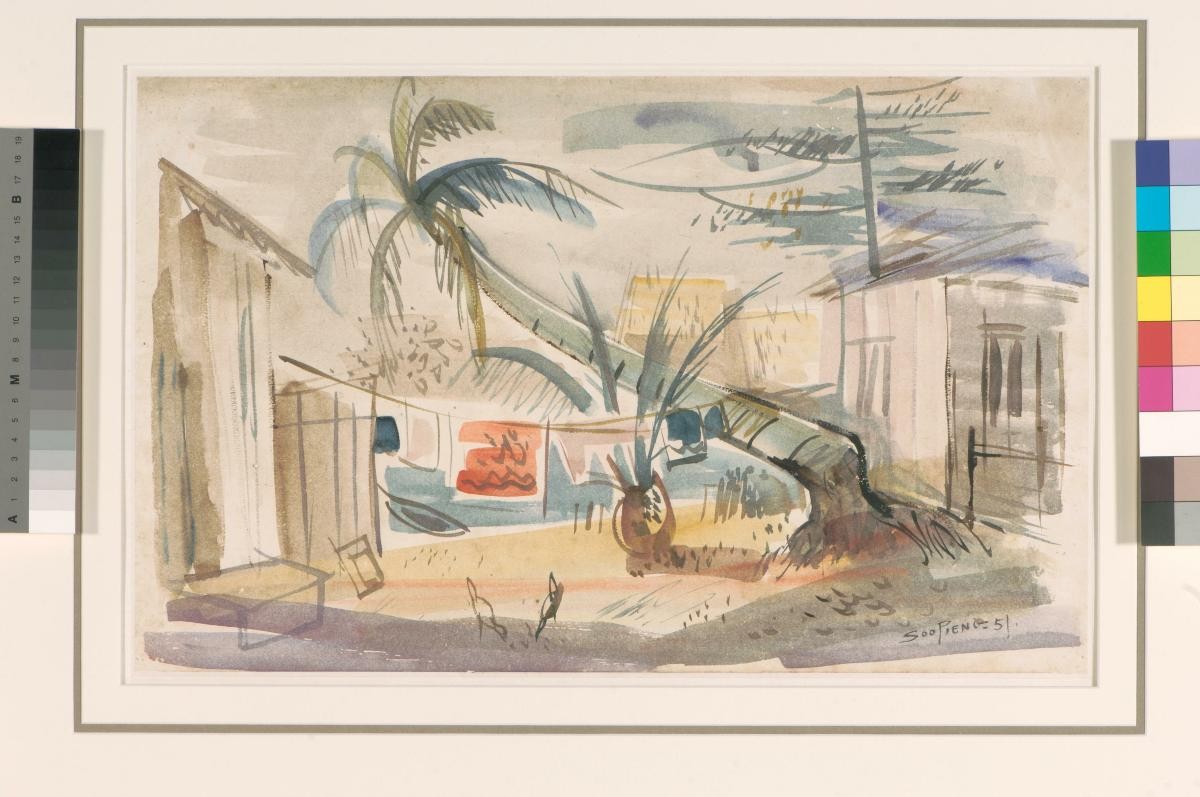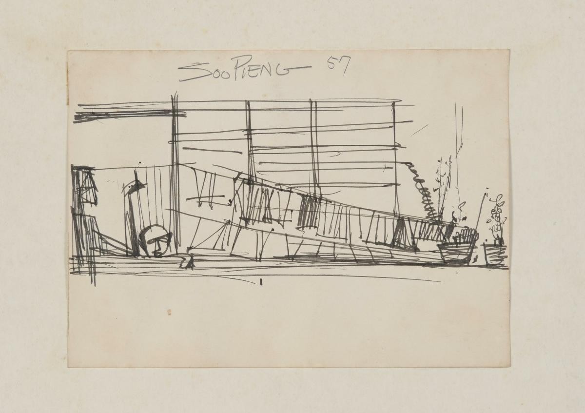 Born in 1923, Lim Tze Peng is mainly a self-taught artist. Ink paintings and calligraphic works are predominantly featured in his work, though there is a small collection of early oils, watercolours and drawings. He created a unique style of ink painting using rich brush and tonal details, and this approach is often regarded as a manifestation of the Nanyang Style in the ink medium. He was awarded the Cultural Medallion in 2003.Lines are paramount in Lim’s works, often taking precedence over other formal aspects of art-making, such as colour, space, texture, mass and volume. Clean and deft linework sketch the street and the people going about their daily chores while minimal colours highlight the laundry that is hung out to dry.