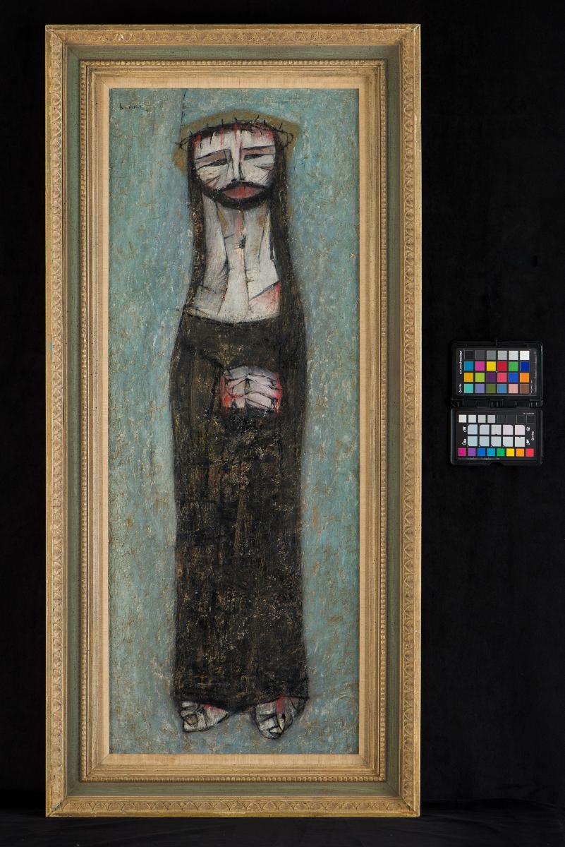 Pablo Baens Santos (1943) was born in the Philippines and is major figure in the Social Realist movement there. He was trained in the University of the Philippines, College of Fine Art. He was an illustrator with one of Philippines leading newspaper, Manila Times, and also one of the founding members of the Kaisahan group, a social realist art group formed in 1976. His works highlight the plight of the rural and urban poor and his concerns about the Filipino social conditions with symbols, such as flags. Belonging to the first wave of social realist artists, Santos' works advocate change and address a wide range of issues that plagued the urban workers then. In 'Bagong Kristo' (translated as 'New Christ'), Santos illustrates the plight of the working class through a familiar and powerful representation. Against the American flag, the common worker is reconfigured as Christ here. Bounded to the dollar sign, which symbolises the power of capitalism, he is sacrificed, in the name of capitalism.