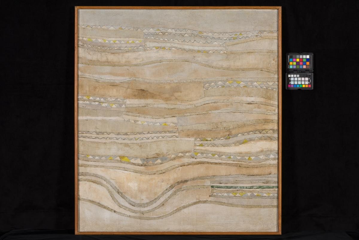 ‘Seascape’, a woodcut print, is a significant work as its wood board was jointly engraved by Choo Keng Kwang and fellow artists Lim Yew Kuan, Foo Chee San, Koh Chen Ti, Tan Tee Chie and Lim Mu Hue–a delightful example of early collaborative work in Singapore art.