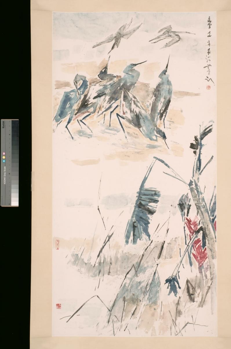 Born in China, Chen Wen Hsi settled in Singapore in 1949 and taught at Nanyang Academy of Fine Arts in the 1950s. Chen was instrumental in the development of the Nanyang Style and is recognised as one of the pioneer artists of Singapore, together with Chen Chong Swee, Georgette Chen, Cheong Soo Pieng and Liu Kang. Highly influential, Chen Wen Hsi is regarded as the doyen of Singapore Chinese-brush artists. Although he painted mainly in Chinese brush, he often ventured into a cubistic style, executed in either oil or ink. An ardent student of nature, Chen is best known for his paintings of animals developed from the Lingnan style. Egrets remain as one of Chen’s favourite subjects, alongside with gibbons and herons. Not only proficient in oil painting and Chinese brush, Chen also mastered the technique of finger painting. Although undated, it is likely that “Black Egrets” is painted in the 1980s using finger painting, typical of his style for that period.