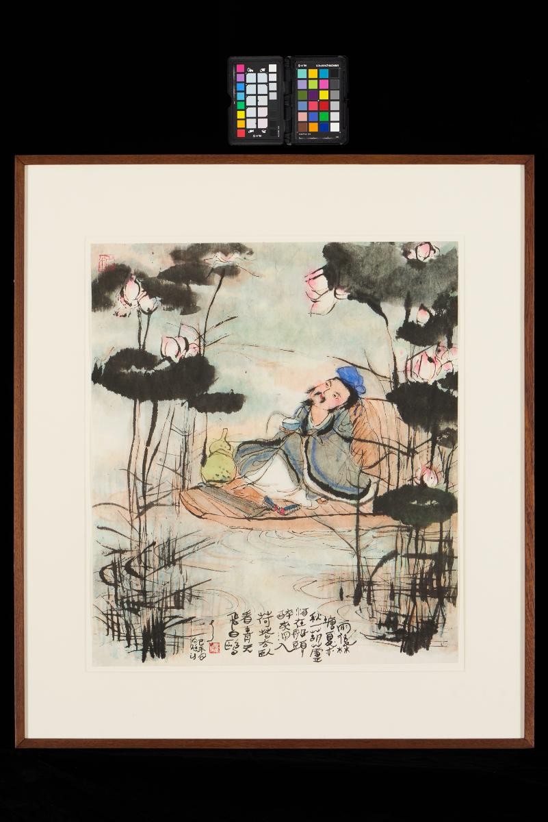 Born to a literati family in Shanghai, China, Huang Yao (1914-1987) received his formative education from his father in classical literati traditions and calligraphy, particularly in the archaic scripts of oracle bone and bronze inscription. In the 1930s, he gained recognition as a talented cartoonist for creating the comic character “Niu Bi Zi” which was widely used as an educational resource in schools. Huang travelled to Southeast Asia after the end of World War II in 1945, and resided in different countries before settling permanently in Malaysia in 1956. He worked primarily as an art educator until his retirement in 1973. A prolific artist, he had held 23 solo and group exhibitions and six retrospective exhibitions.Contentment and the enjoyment of simple pleasures are recurring themes in Huang’s art and here a man reclines on a daybed, set by a pond in a bamboo grove, with not a care in the world.