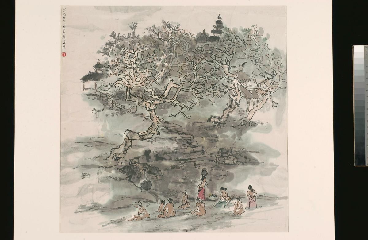Born in 1923, Lim Tze Peng is largely a self-taught artist. In his oeuvre, ink paintings and calligraphic works feature prominently, although there is a small number of oils, watercolours and drawings. He created a unique style of ink painting using rich brush and tonal details, and this approach is often regarded as a manifestation of the Nanyang Style in the ink medium. Lim, a school principal until his retirement in the early 1980s, was awarded the Cultural Medallion by the Singapore government in 2003.The idyllic life of Bali is a source of inspiration for generations of Singapore artists, from the pioneers to the present generation. Lim too was enchanted and made multiple visits there, often returning with artworks that document the everyday life of the Balinese. ‘Bathers’ depicts people washing in a river.