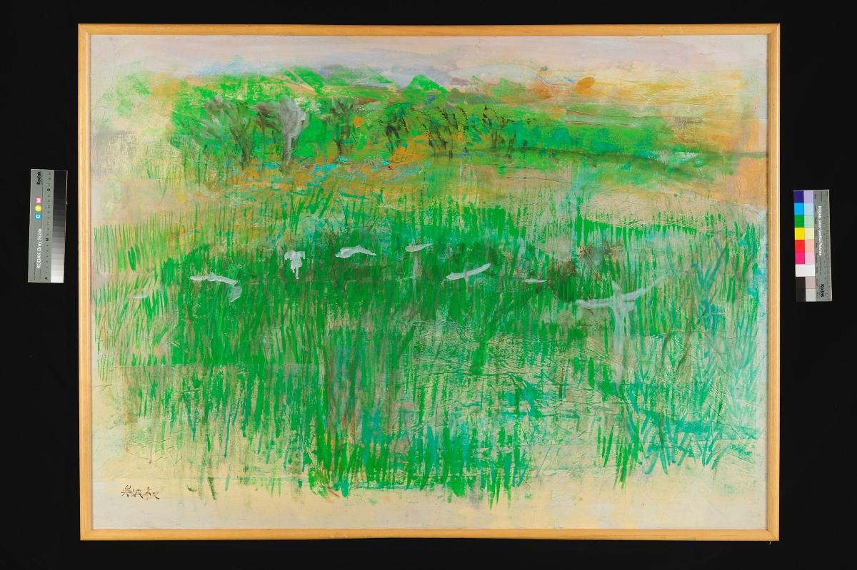 Born in Fujian Province, Liu Kang (1911-2004) received his formal training in Shanghai Academy of Fine Art, where he was exposed to Chinese paintings. In 1928, he went to Paris where he was influenced by art movements such as Fauvism and Post-Impressionism. Not only was he one of Singapore’s pioneer artists, he was also a leading figure in the Society of Chinese Artists and the Singapore Art Society. In 1970, he was awarded the Public Service Star for his contributions in the field of art.Liu often travelled within and outside Singapore to seek subjects for his art. With brilliant colours, Liu renders a large driftwood on a shore.