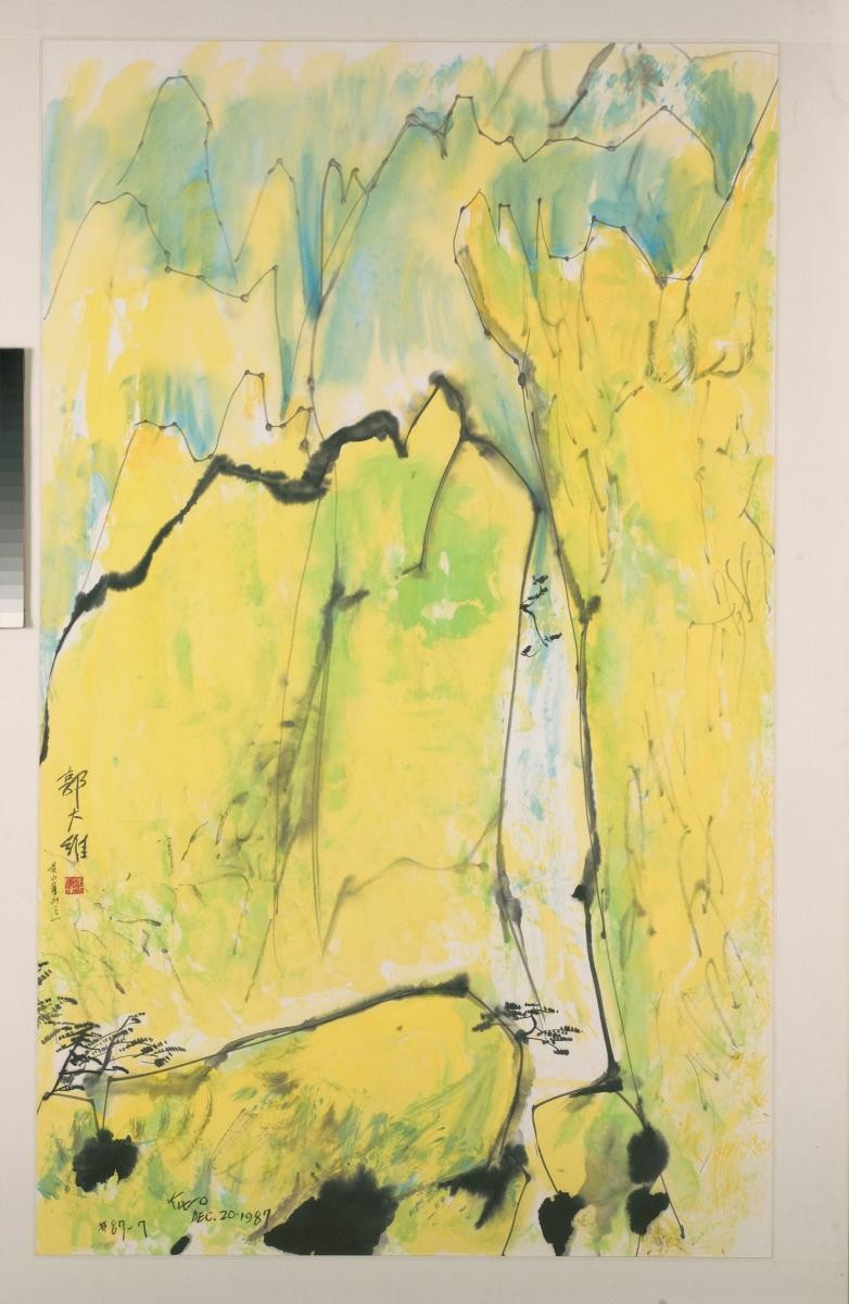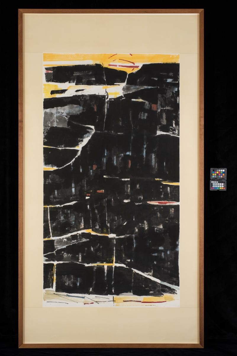 Born in 1946 in Malaysia, self-taught painter and sculptor Thang Kiang How’s talent and community service is variously recognised, including: Singapore’s Public Service Medal (1981), Dr Tan Tsze Chor Award (1982), and Special Award, UOB Painting of the Year competition (1985, 1986 and 1987). Exhibiting nationally and internationally, Thang was also President of the Modern Art Society Singapore (1981-93).With this painting Thang returns to his artistic roots of painting nature, particularly mountains. He began his ‘Blue Mountain’ series in 1980 (marking his gradual shift away from realism) as a result of frequent business trips to China. The vastness of the land, with its trees and mountains, captured Thang’s spirit and under whose inspirational influence he clearly remained a decade later: “I love painting nature, particularly mountains. Mountains ‘live’, changing from hour to hour. I chose to paint the mountains blue not to suggest melancholia but peace and quietness”.