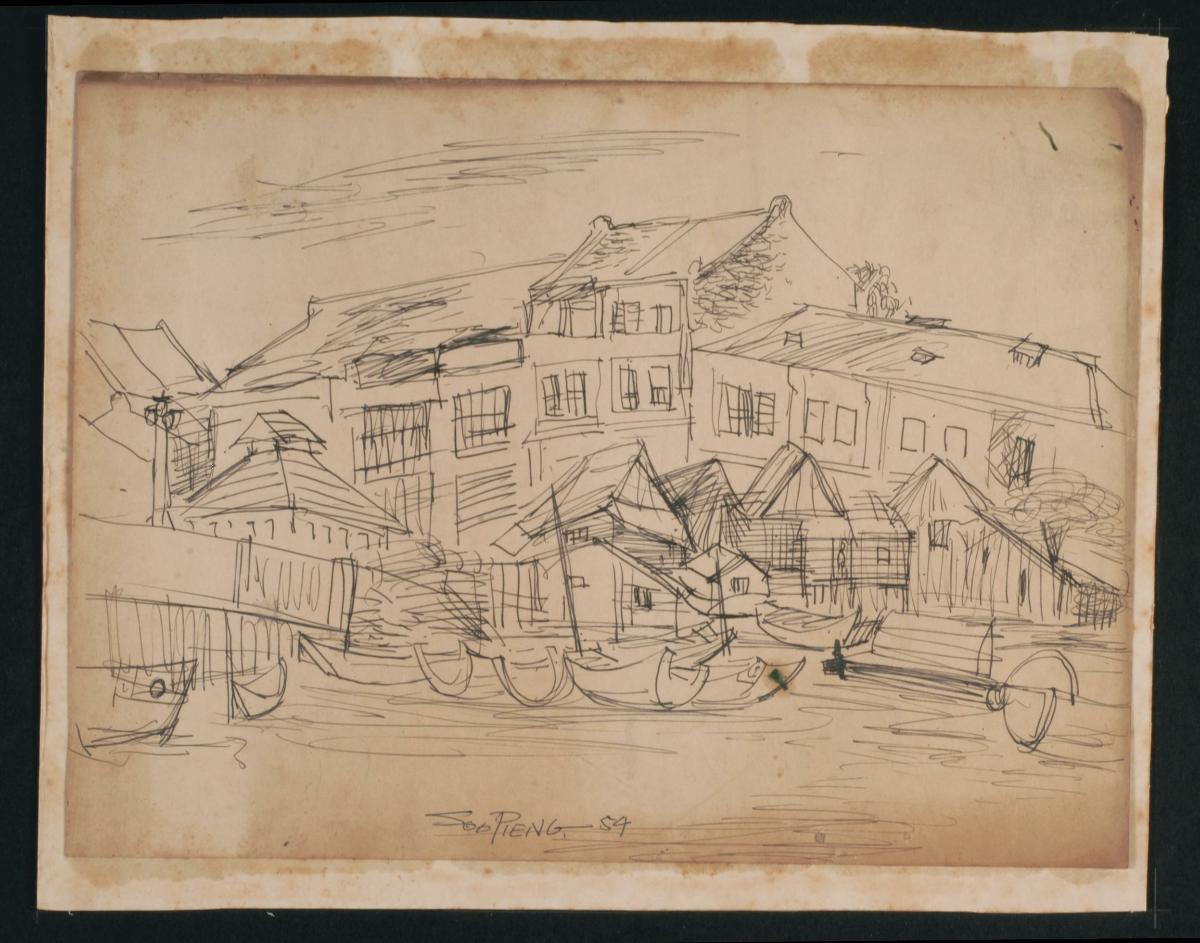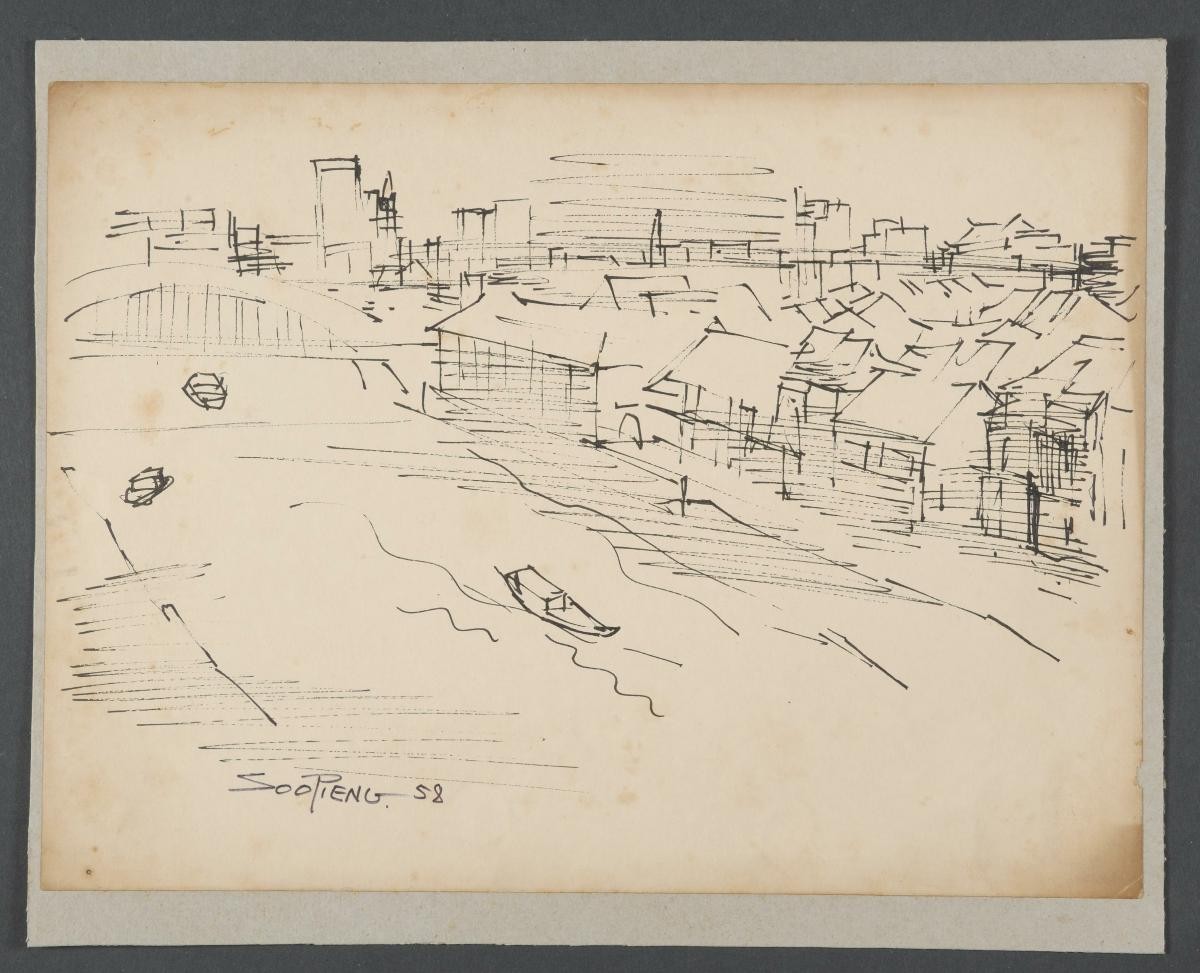 Born in 1923, Lim Tze Peng is largely a self-taught artist. In his oeuvre, ink paintings and calligraphic works feature prominently, although there is a small number of oils, watercolours and drawings. He created a unique style of ink painting using rich brush and tonal details, and this approach is often regarded as a manifestation of the Nanyang Style in the ink medium. Lim, a school principal until his retirement in the early 1980s, was awarded the Cultural Medallion by the Singapore government in 2003.Despite painting the Singapore River many times in his career, the river under Lim’s brush is never the same as he challenges himself to find refreshing new perspectives every time. This painting shows bumboats against a backdrop of elegant arches and picturesque shophouses.