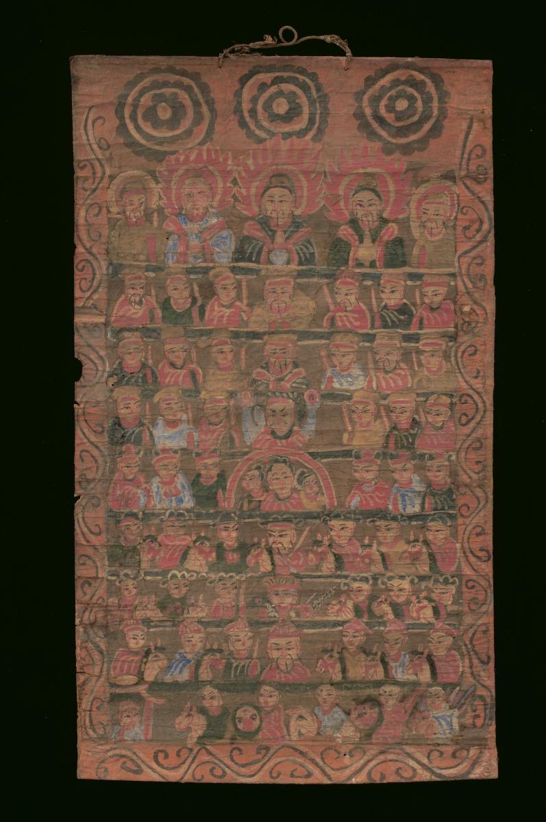 This painting was part of a set of 18 produced for ritual use by the Yao people. It depicts the pantheon of Daoist deities. The reverse of the painting has an inscription with the date and name of the family who commissioned the painting.Sets of paintings were used with banners for the initiation of new male members into the lineage. The Daoism practiced by the Yao is an ancient form dating back to the 13th century and some of their rituals are no longer practiced by other Daoist communities. The Yao is a minority group who migrated into northern Thailand from neighbouring regions during the 18th and 19th centuries.