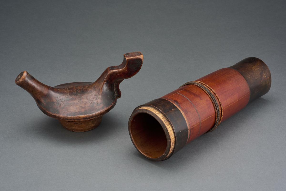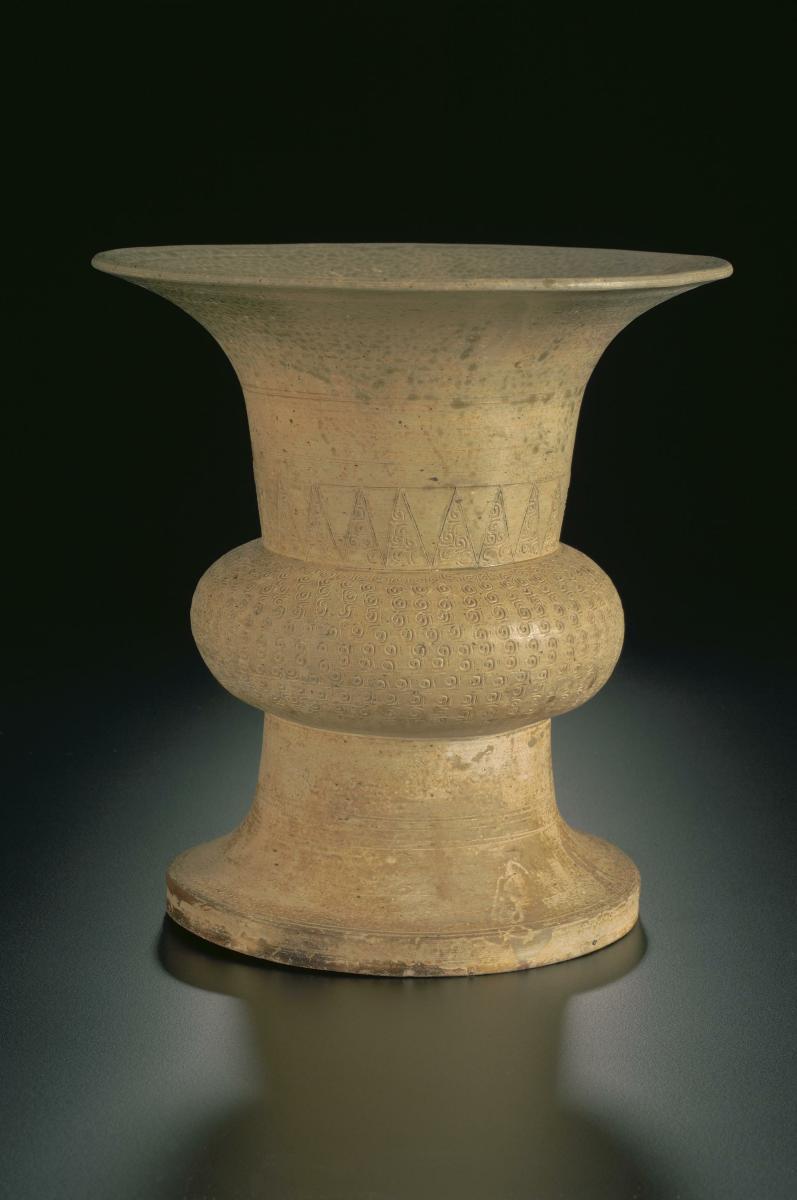 This large vessel is known as a fou or lei. The most distinctive features in this vessel shown here are its buffalo-head rings and its swirling and intertwining design. These rings were intended for hanging ropes and the vessel was used for storing wine. Wine drinking had been a crucial part of early Chinese civilisation since the Shang dynasty. The intertwining design covering the main register of the body is called panlong wen (intertwining dragon motif) or panchi wen. This is actually a variation of the kuilong (dragon) motif and was particularly popular during the Spring and Autumn (722-481 BCE) and Warring States period (481-256 BCE).