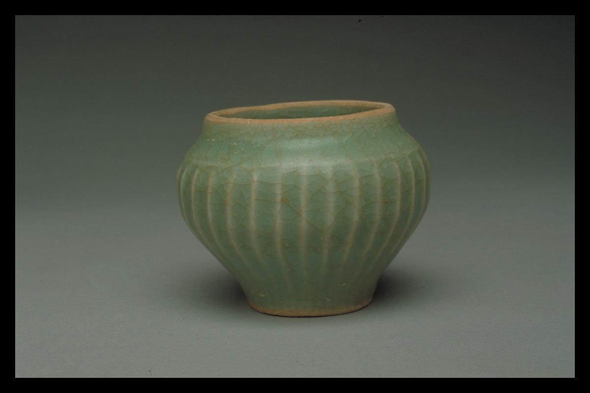 This undecorated jarlet of squat bulbous form is covered with a crazed, light green glaze.This jarlet was acquired in the Philippines and was used as a utility ware or for burials.Produced in the Longquan kilns of Zhejiang province, such wares are referred to as ‘celadon’, a generic term for green-glazed wares in Chinese ceramics produced since the Southern Song dynasty. These wares are prized for their lustrous green tone that resembles jade. Green- glazed wares were obviously highly esteemed in China as they were uncovered in tomb excavations all over the country. They were also immensely popular overseas and can be found in almost all parts of Asia, parts of the Middle East and even Africa.
