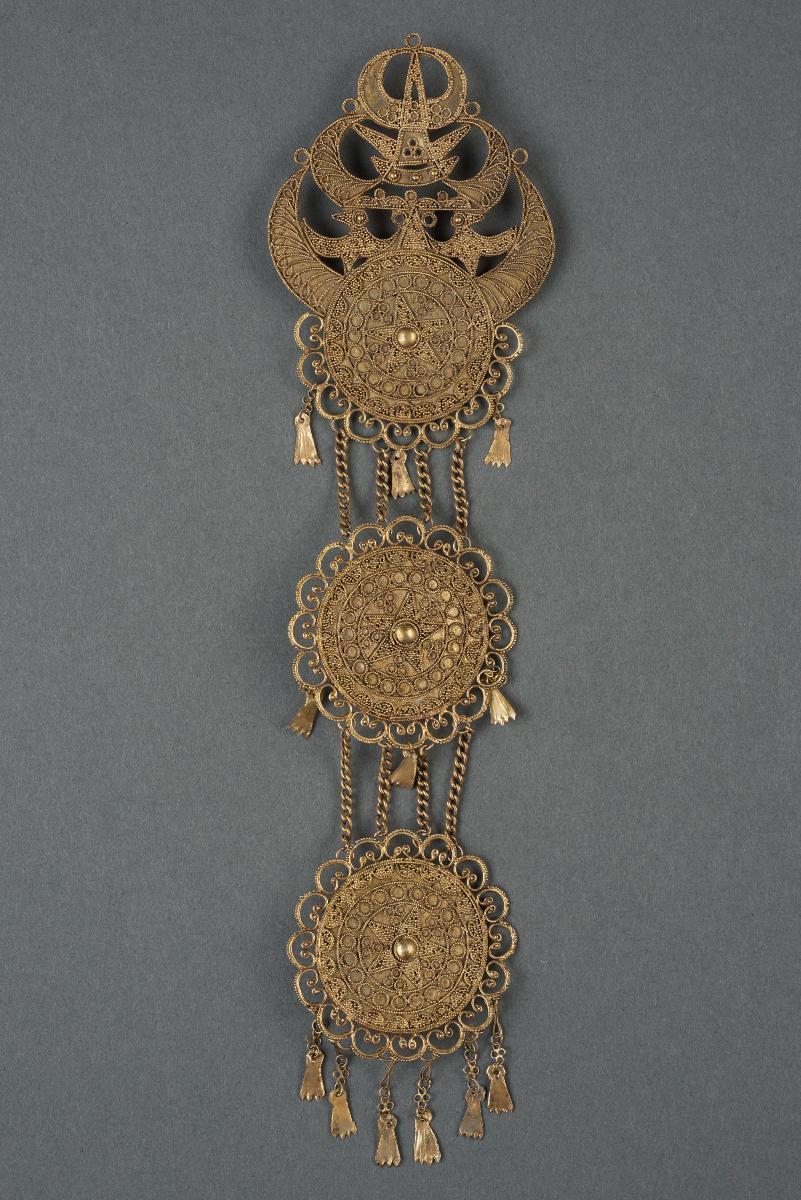 Such brooches, known as 'kerosang', were worn by Peranakan women as fasteners on blouses and usually come in groups of three. As the three gold brooches are joined by a chain, this kerosang in foliage design is known as 'kerosang rantay' ('rantay' being the Baba Malay word for chain). The origin of the kerosang is uncertain, although it has been suggested that kerosang came from the Malays, who call them 'kerongsang'. Kerosang were worn by ladies in island Southeast Asia as well as mixed heritage communities such as the Peranakan Chinese.