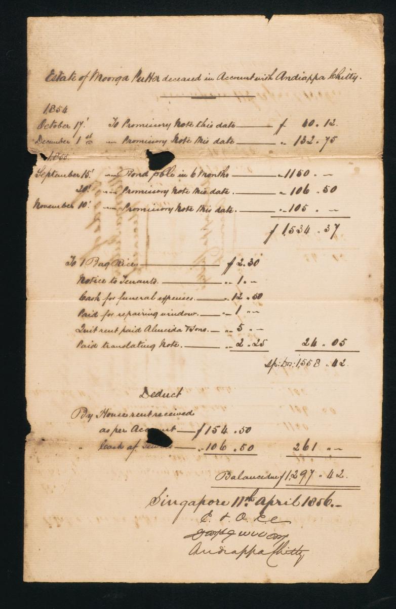 This is a receipt dated 1 October 1856 acknowledged by Andiappa Chitty, who stated that he received from the official administrator of the estate of the deceased Mooroogahpetten, George William Le Cerf, the sum of 1297.42 Spanish dollars owed to him by the estate of the deceased. This receipt is part of a collection of legal documents from the 19th and early 20th centuries which provides a glimpse into the work of the notable personalities who left their mark on Singapore’s legal history, and the economic and other transactions undertaken by ordinary immigrants in 19th century Singapore that tell stories of misfortune and indebtedness which would otherwise have disappeared from history.