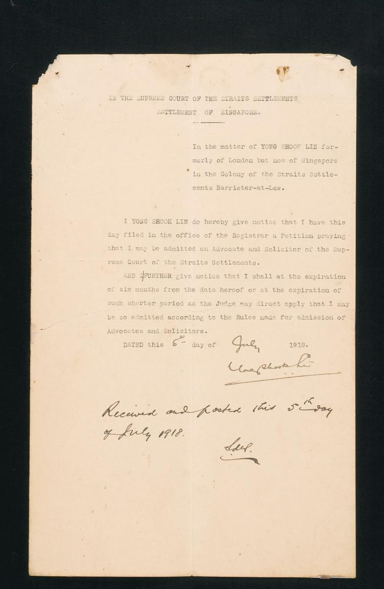 This is a note written by the Commissioner for Oaths, M. Rodyk, pointing to the certificate marked 'A' which was referred to in the declaration of Yong Shook Lin. It is part of a collection of legal documents from the 19th and early 20th centuries which provides a glimpse into the work of the notable personalities who left their mark on Singapore’s legal history, and the economic and other transactions undertaken by ordinary immigrants in 19th century Singapore that tell stories of misfortune and indebtedness which would otherwise have disappeared from history.