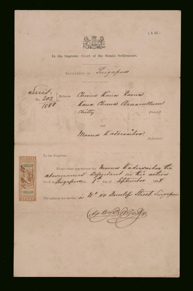 This is a memo of the appointment of a solicitor for the defendant Veeyena Rana Payna Reena Moona Mootoocurpra Chitty issued on 14 February 1887. It is part of a collection of legal documents from the 19th and early 20th centuries which provides a glimpse into the work of the notable personalities who left their mark on Singapore’s legal history, and the economic and other transactions undertaken by ordinary immigrants in 19th century Singapore that tell stories of misfortune and indebtedness which would otherwise have disappeared from history.