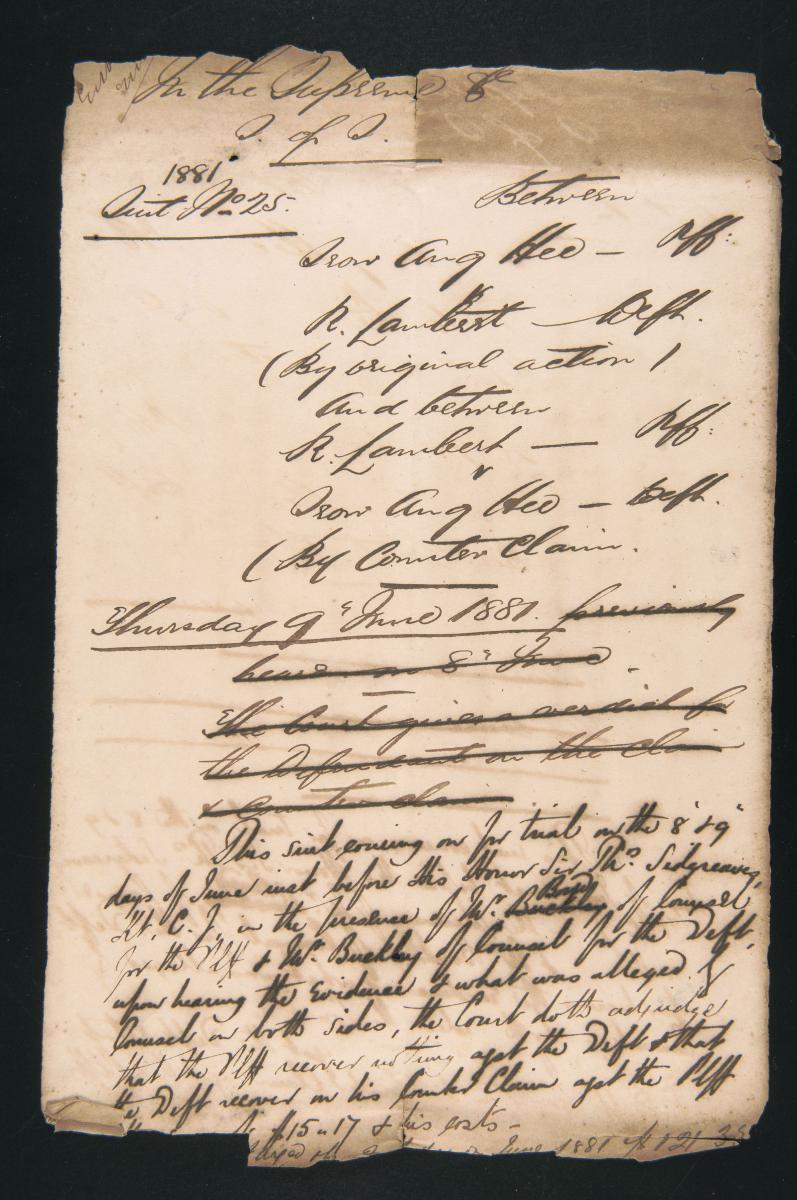 This is an entry of appearance dated 23 February 1883 for Rudolph Lambert , who is the defendant in the suit against Seow Ang Hee. It is part of a collection of legal documents from the 19th and early 20th centuries which provides a glimpse into the work of the notable personalities who left their mark on Singapore’s legal history, and the economic and other transactions undertaken by ordinary immigrants in 19th century Singapore that tell stories of misfortune and indebtedness which would otherwise have disappeared from history.