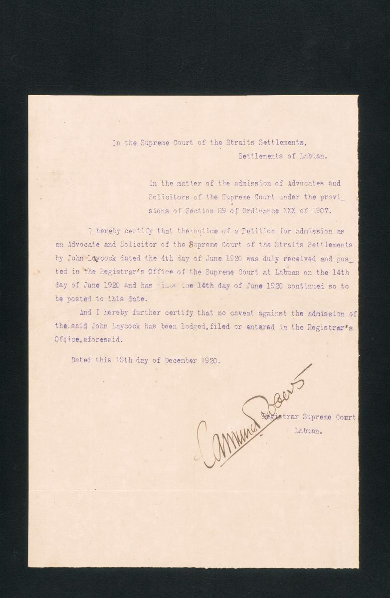 This is a registrar's certificate issued on 8 December 1920 by the Registrar of the Supreme Court of the Straits Settlements in Singapore for John Laycock. It is part of a collection of legal documents from the 19th and early 20th centuries which provides a glimpse into the work of the notable personalities who left their mark on Singapore’s legal history, and the economic and other transactions undertaken by ordinary immigrants in 19th century Singapore that tell stories of misfortune and indebtedness which would otherwise have disappeared from history.