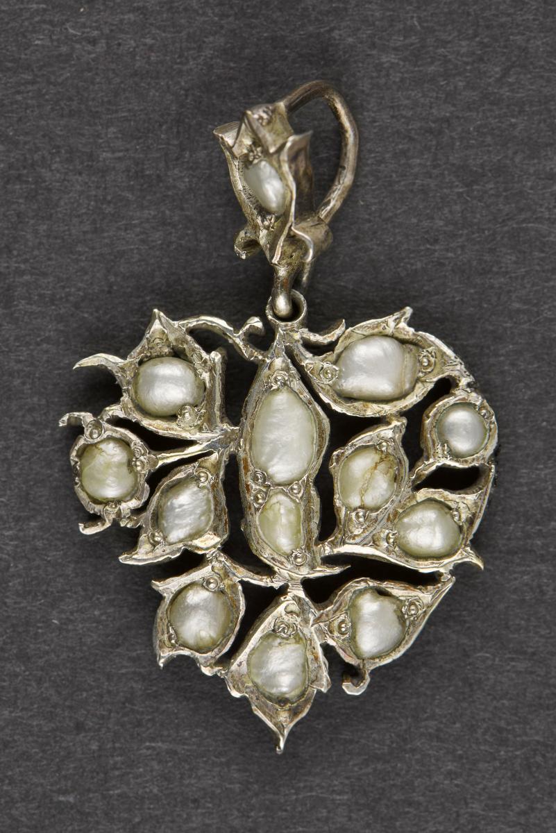 This ear stud belonged to a set of jewellery consisting of silver hairpins, brooches and rings studded with pearls as well as green and blue gems. Mourning jewellery is worn during the mourning period of three years as a show of respect for the loss of loved one. During this time, the usual gold and diamond ornaments are exchanged for more sombre jewellery such as this.