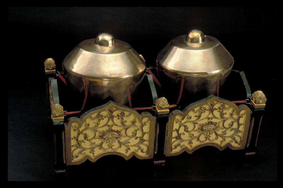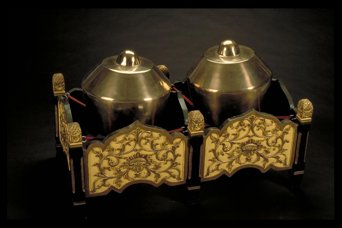 These three small gongs on a stand are known as the kempul. The term 'gamelan' refers to the action ('an') of hammering ('gamel') bronze instruments such as gongs and drums among several other types of instruments with beaters. The bronze instruments play the main melody and are accompanied by softer wind, wood and string instruments. Today gamelan music remains an important part of court and village life in Java. Many sets are kept as royal heirlooms (pusaka) and are played at important ceremonies.