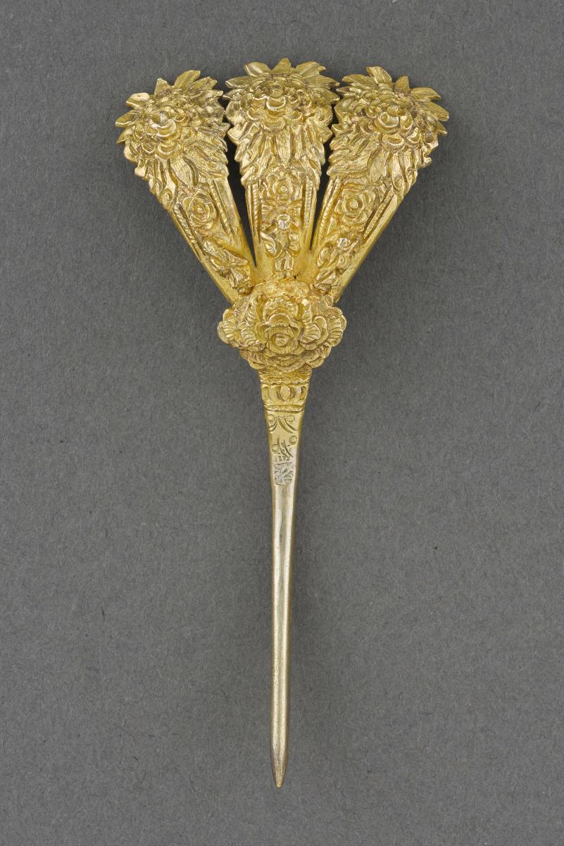 This Southern Chinese-style bow-shaped hairpin with floral motifs, and is part of a set of three comprising of two bow-shaped hairpins, one larger and one smaller, and a third larger decorative hairpin. The larger decorative hairpin features the three auspicious Daoist personages, "Fu, Lu, Shou" (福禄寿) which represent good fortune, prosperity and longevity. The use of this form of hairpins can be found in Ming dynasty paintings, and this set of hairpins was most likely used by the Peranakan women in Indonesia.