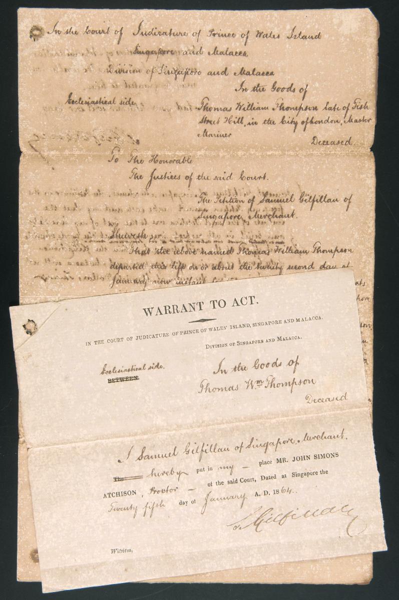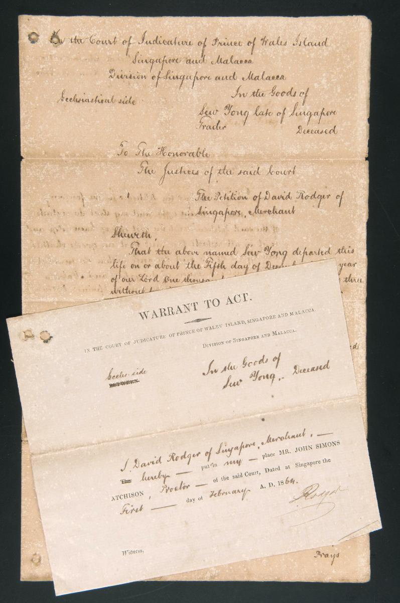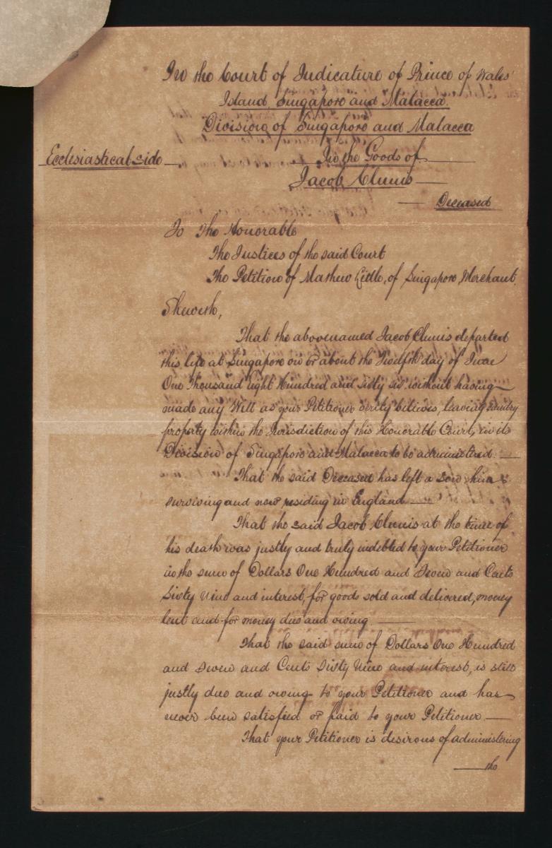These are the warrant to act and the petition issued by Mathew Little concerning the administration of the estate of Jacob Clunis. They are part of a collection of legal documents from the 19th and early 20th centuries which provides a glimpse into the work of the notable personalities who left their mark on Singapore’s legal history, and the economic and other transactions undertaken by ordinary immigrants in 19th century Singapore that tell stories of misfortune and indebtedness which would otherwise have disappeared from history.